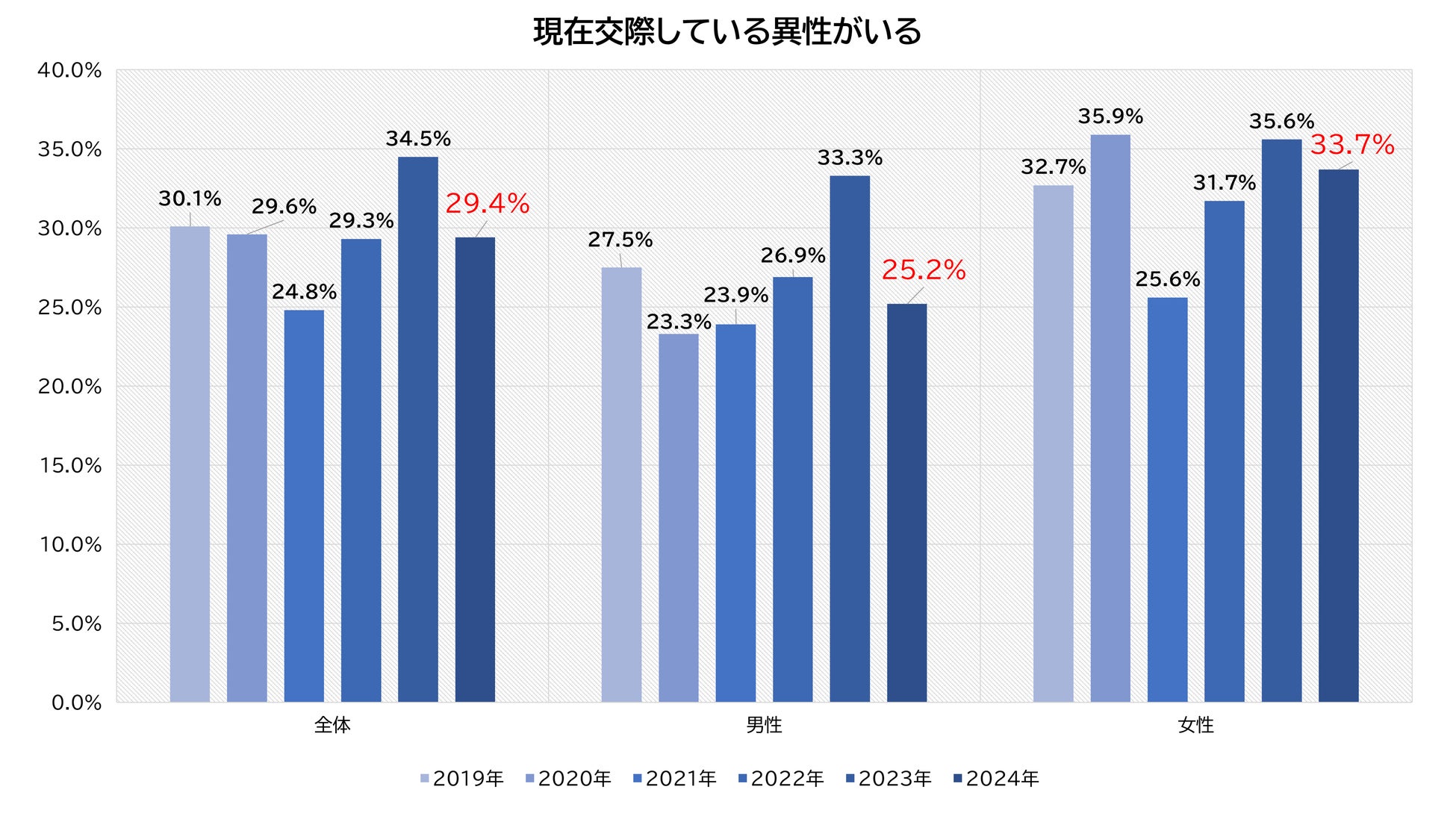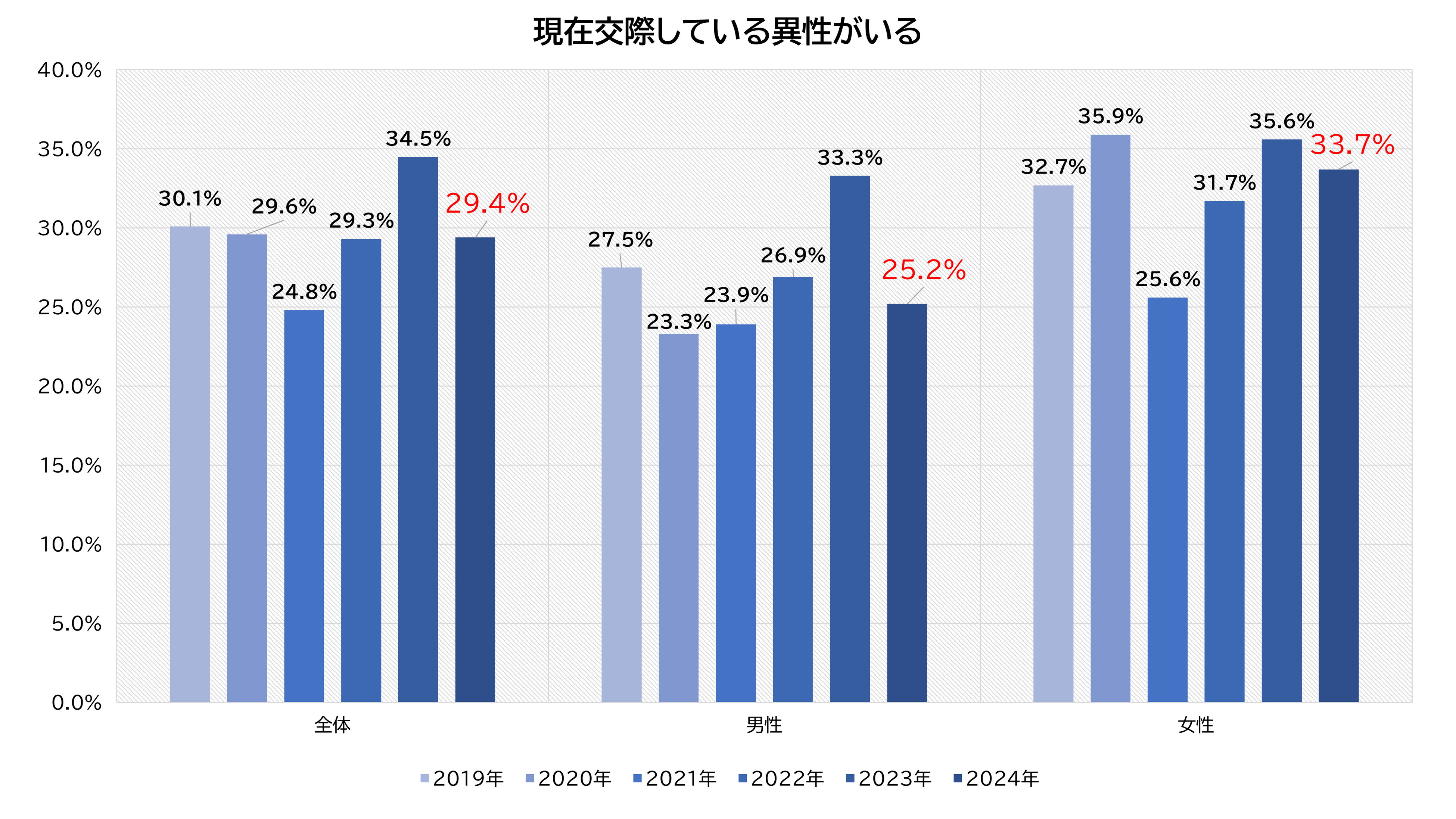 「現在交際している異性がいますか?」という質問に対し、全体で29.4%が「いる」と回答し、過去7年間で最高だった昨年の34.5%から5.1ポイント減少しました。男性は昨年(33.3%)から8.1ポイント減少の25.2%と4年ぶりに低下に転じました。女性も昨年の35.6%から1.9ポイント減少の33.7%となり、男女ともにコロナ禍明けの自粛解禁で交際に積極的になり交際相手がいる率が増加した昨年の勢いが落ち、過去5年の平均並みに落ち着いたと見られます。
