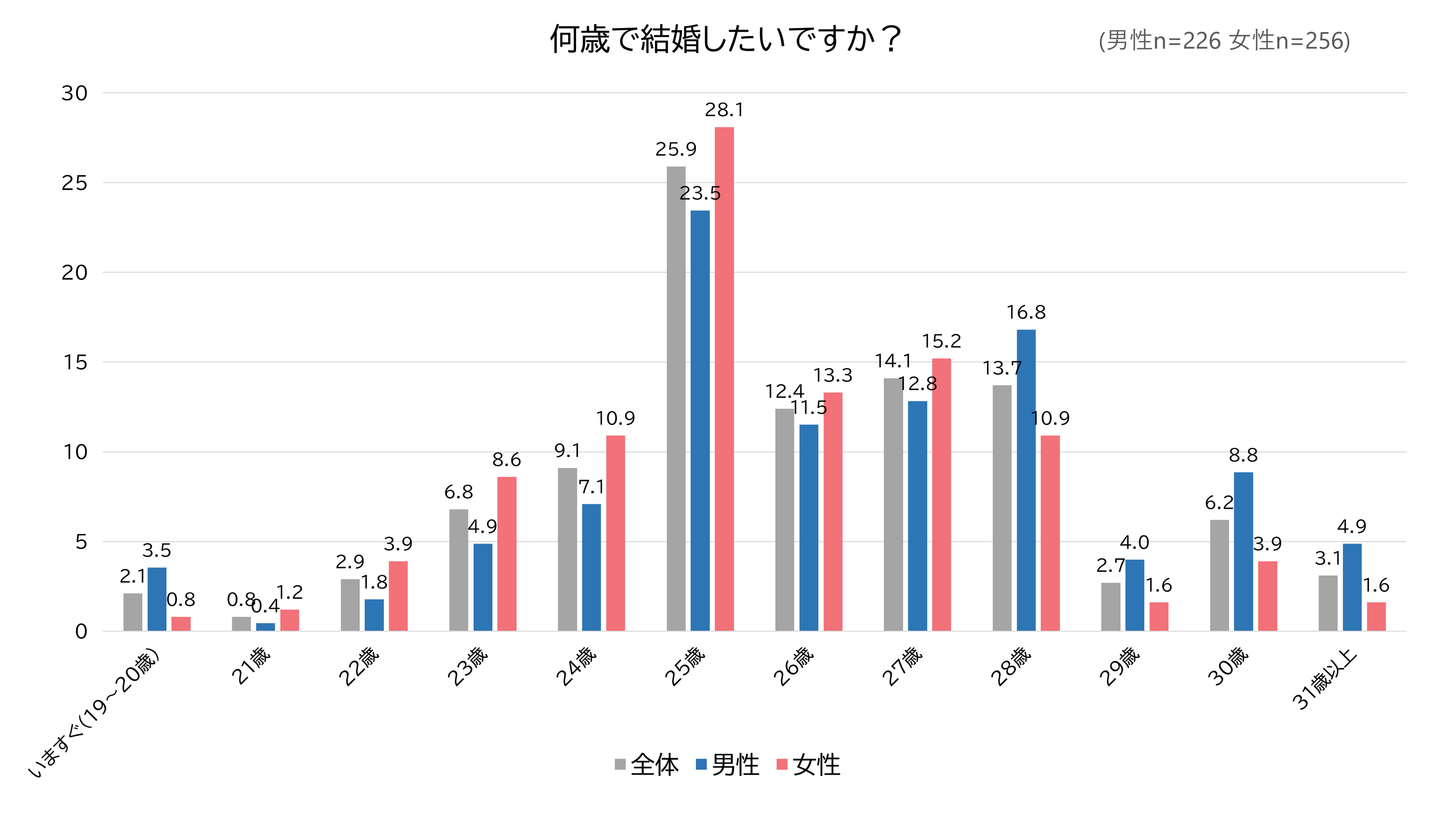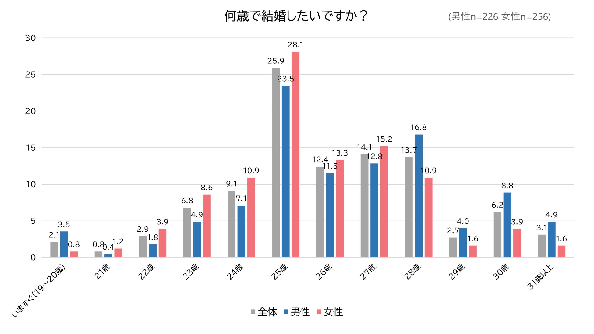 「結婚したい」と回答した482名に、何歳で結婚をしたいかを質問したところ、男女ともに最も割合が高かった年齢は、昨年同様25歳(25.9%)でした。以降は27歳(14.1%)、28歳(13.7%)、 26歳(12.4%)、24歳(9.1%)と続きました。昨年2位だった26歳が4位に後退し、昨年2位・3位だった28歳・27歳がそれぞれ1ランク繰り上がりました。