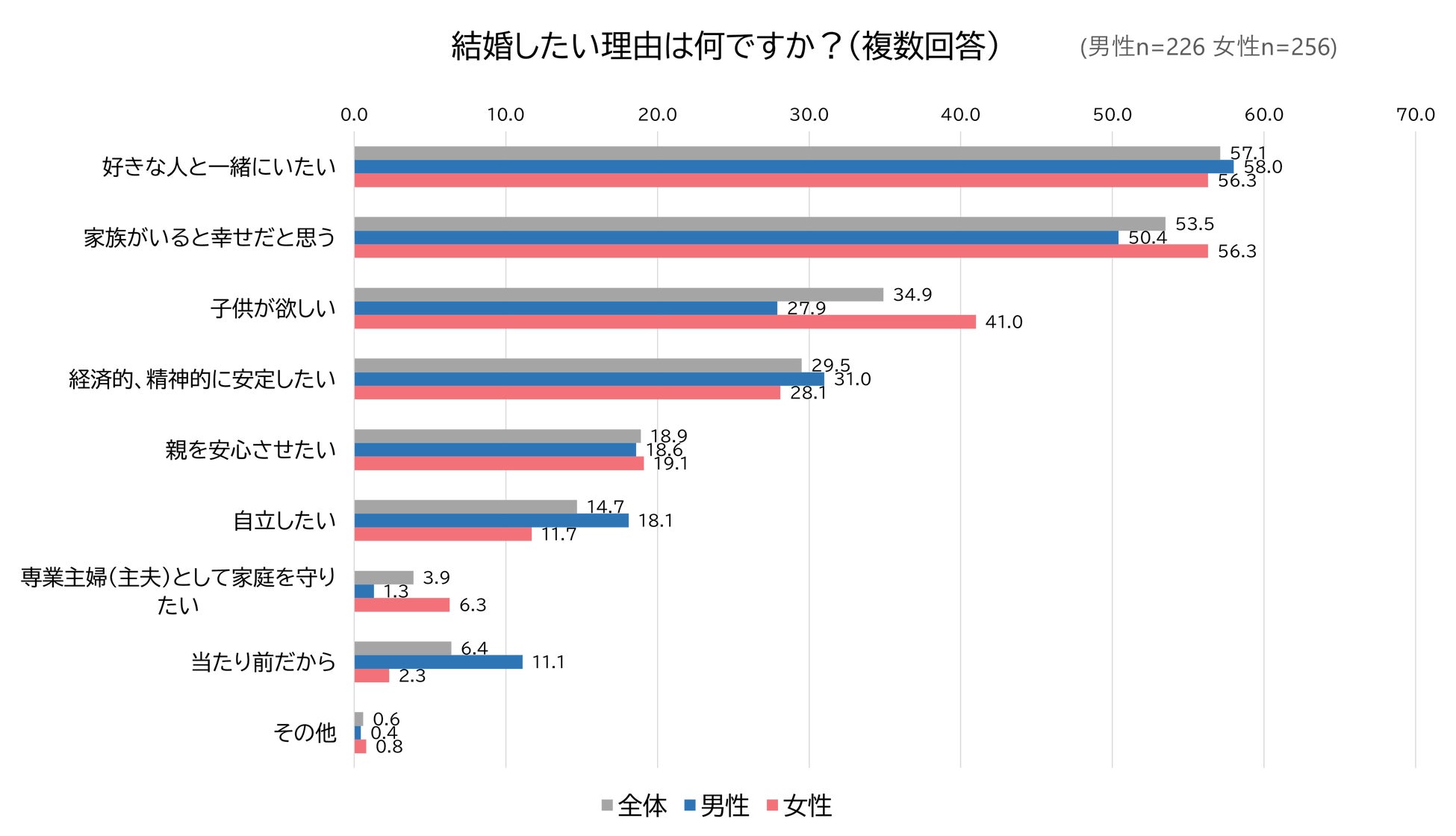 「結婚したい」理由については、「好きな人と一緒にいたい」 「子供が欲しい」 「家族がいると幸せ」の3つが例年と同じく上位となりました。トップの「好きな人と一緒にいたい」は昨年(62.6%)から5.5ポイント減少、2番目に多い「家族がいると幸せ」は昨年(55.1%)から1.6ポイント減少、「子供が欲しい」は昨年(36.8%)から1.9ポイント減少し、過去7年間で最低値となりました。「子供が欲しい」と回答した新成人を男女別にみると、女性は41.0%と昨年(42.4%)から1.4ポイント減少、男性は27.9%と昨年(31.1%)から3.2ポイント減少し、最も男女差が大きく13.1ポイントに広がりました。