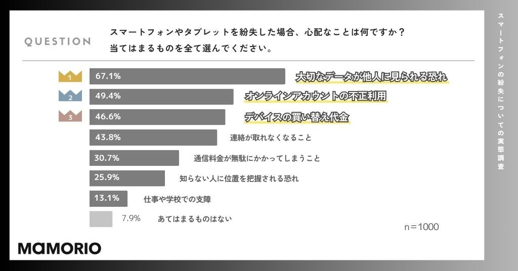 次いで「オンラインアカウントの不正利用」(49.4%)、「デバイスの買い替え代金」(46.6%)、「連絡が取れなくなること」(43.8%)と続きました。