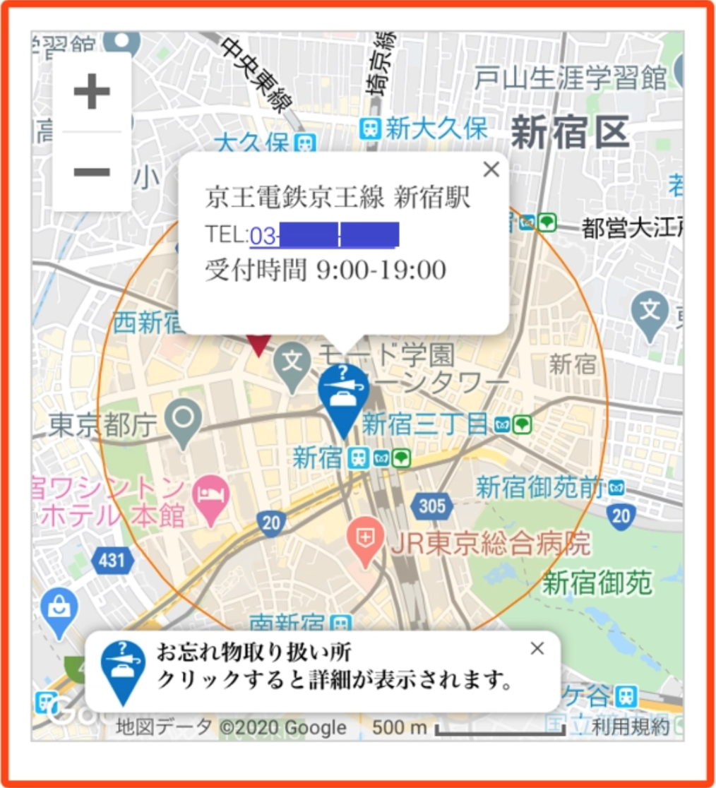 こちらの「位置検索サポート」では検索した位置情報の近くに、遺失物センターがある場合に連絡先を表示する遺失物センターの表示機能が備わっております。