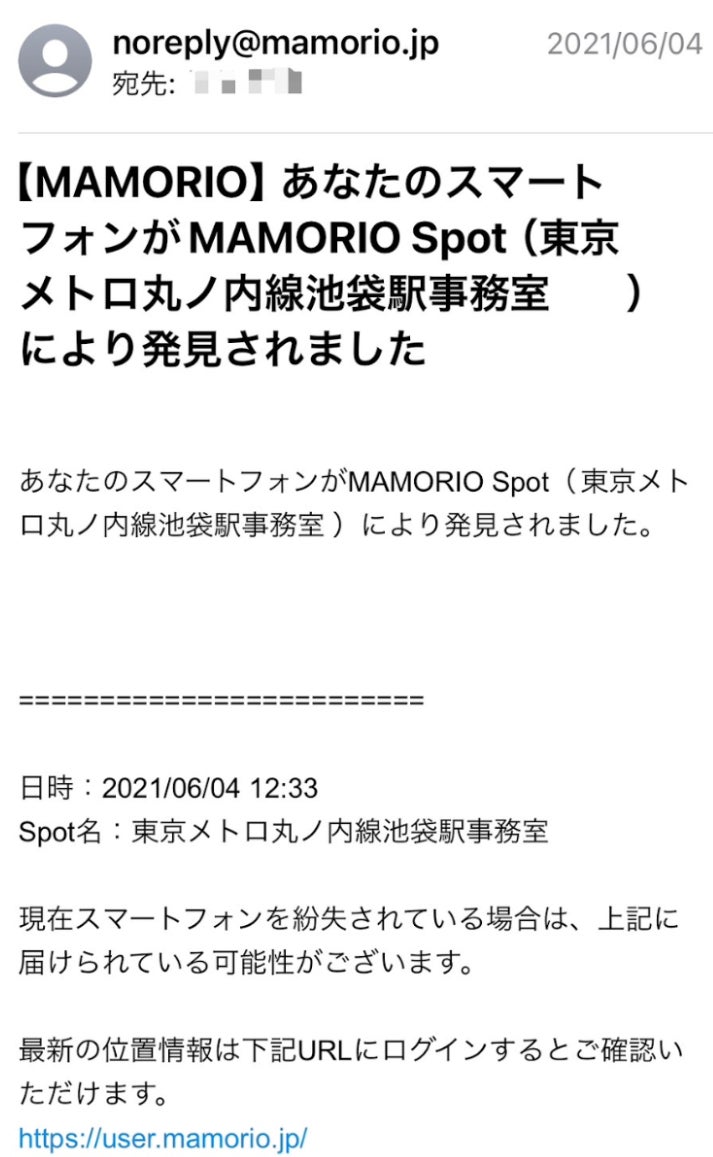 検知された情報は、ユーザーが登録したメールアドレスに自動送信され、スマートフォンが遺失物センターに届けられたことをすぐにお知らせしてくれます。