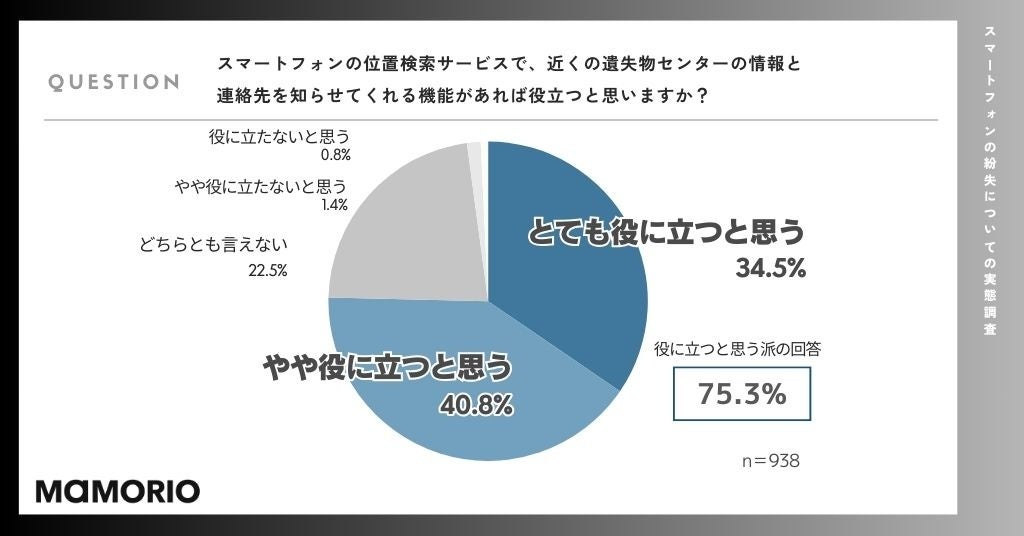 34.5%の人が「とても役に立つ」と答えているように、スマートフォンの紛失は個人情報漏えいなど深刻なリスクが伴うため、確実な回収手段を熱望しているユーザーが多数いることがうかがえます。