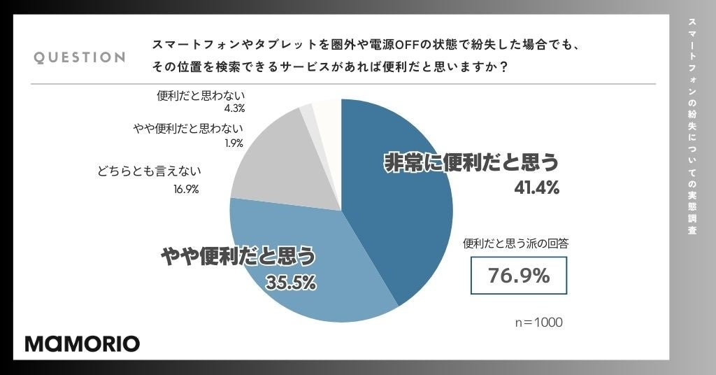 次に「スマートフォンやタブレットを圏外や電源OFFの状態で紛失した場合でも、その位置を検索できるサービスがあれば便利だと思いますか?」という設問に対し、「便利だと思う」と回答した人が全体の76.9%に上りました。