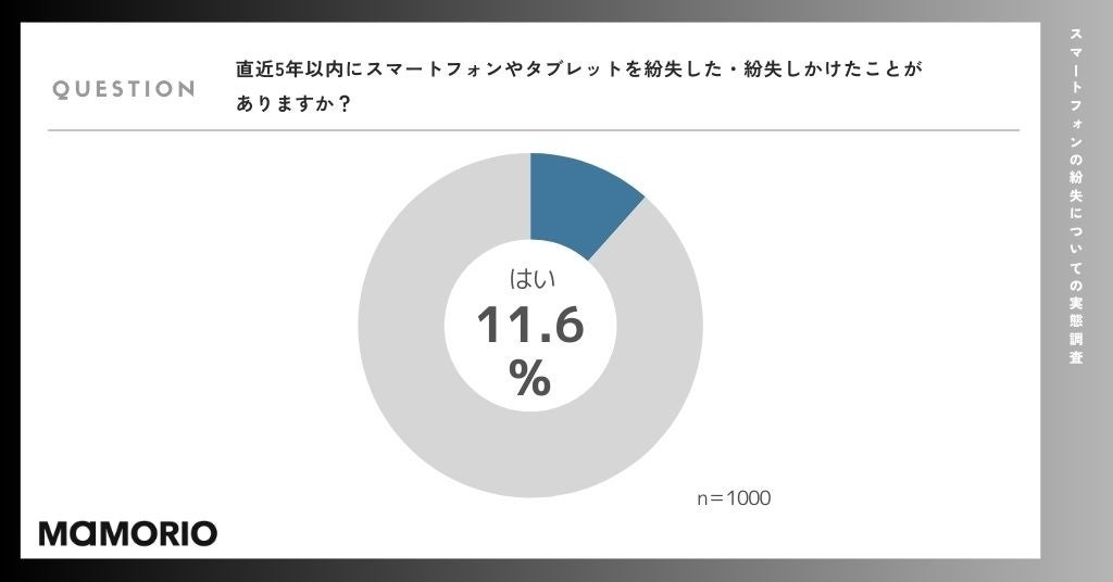 まず、「あなたは直近5年以内にスマートフォンやタブレットを紛失した・紛失しかけたことがありますか?」といった質問を行ったところ、11.6%が「はい」、88.4%が「いいえ」という結果となりました。