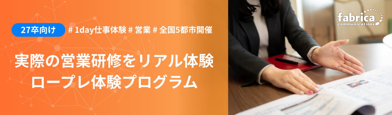 株式会社ファブリカホールディングス(本社:東京都港区、代表取締役社長CEO:谷口政人)の完全子会社、株式会社ファブリカコミュニケーションズ(本社:愛知県名古屋市中区、代表取締役社長CEO:谷口政人、以下「当社」)は、2027年新卒の方を対象とする「仕事体験」をテーマとした1DAYインターンシップを全3種類開催いたします。