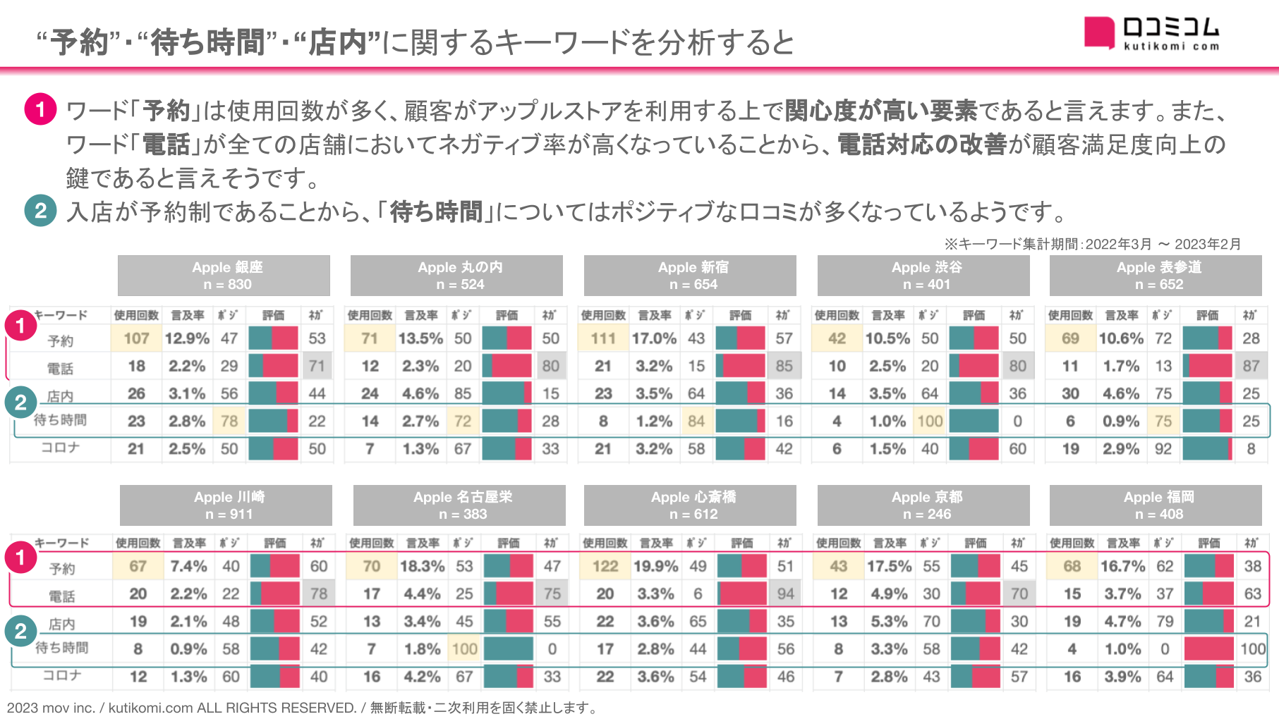 」は全ての店舗においてネガティブ率が高くなっており、電話対応の改善