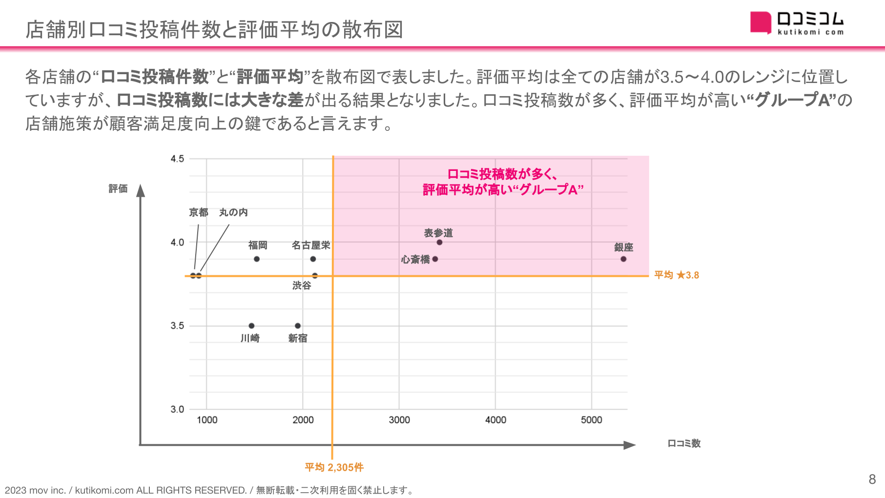 ”を散布図で表しました。評価平均は全ての店舗が3.5〜4.0のレンジに位置していますが、口コミ投稿数には大きな差