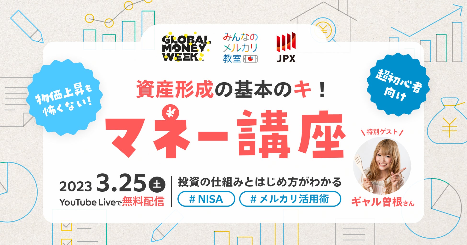 株式会社メルカリ(以下、メルカリ)は、このたび、2023年のグローバルマネーウィークイベントとして、株式会社東京証券取引所(以下、東京証券取引所)と共催で、特別ゲストにギャル曽根さんをお招きし、物価上昇下に活用できる初心者向けのマネー講座を3月25日(土)に開催いたします。