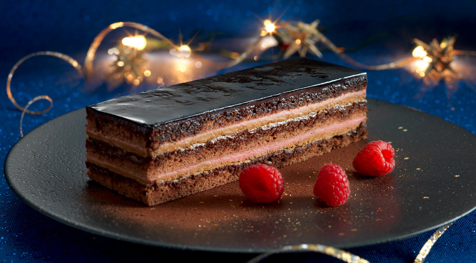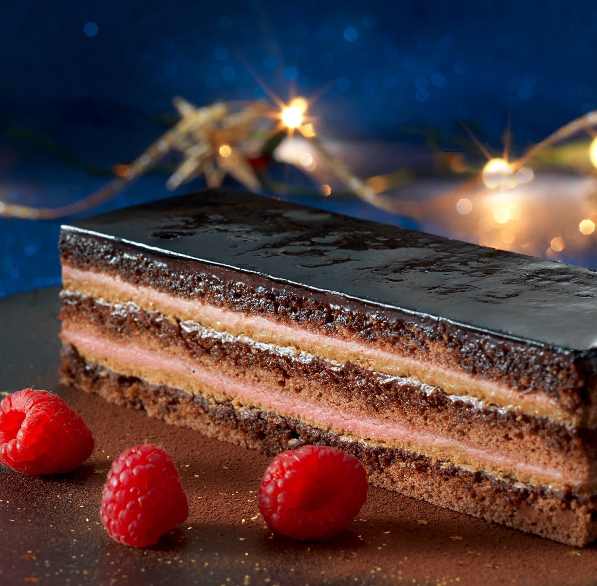 美しい光沢を纏ったチョコレートの層に、甘酸っぱいフランボワーズの層、香り高いコーヒーの層が何層にも重なり合い、口に入れた瞬間、濃厚で贅沢な味わいが広がります。