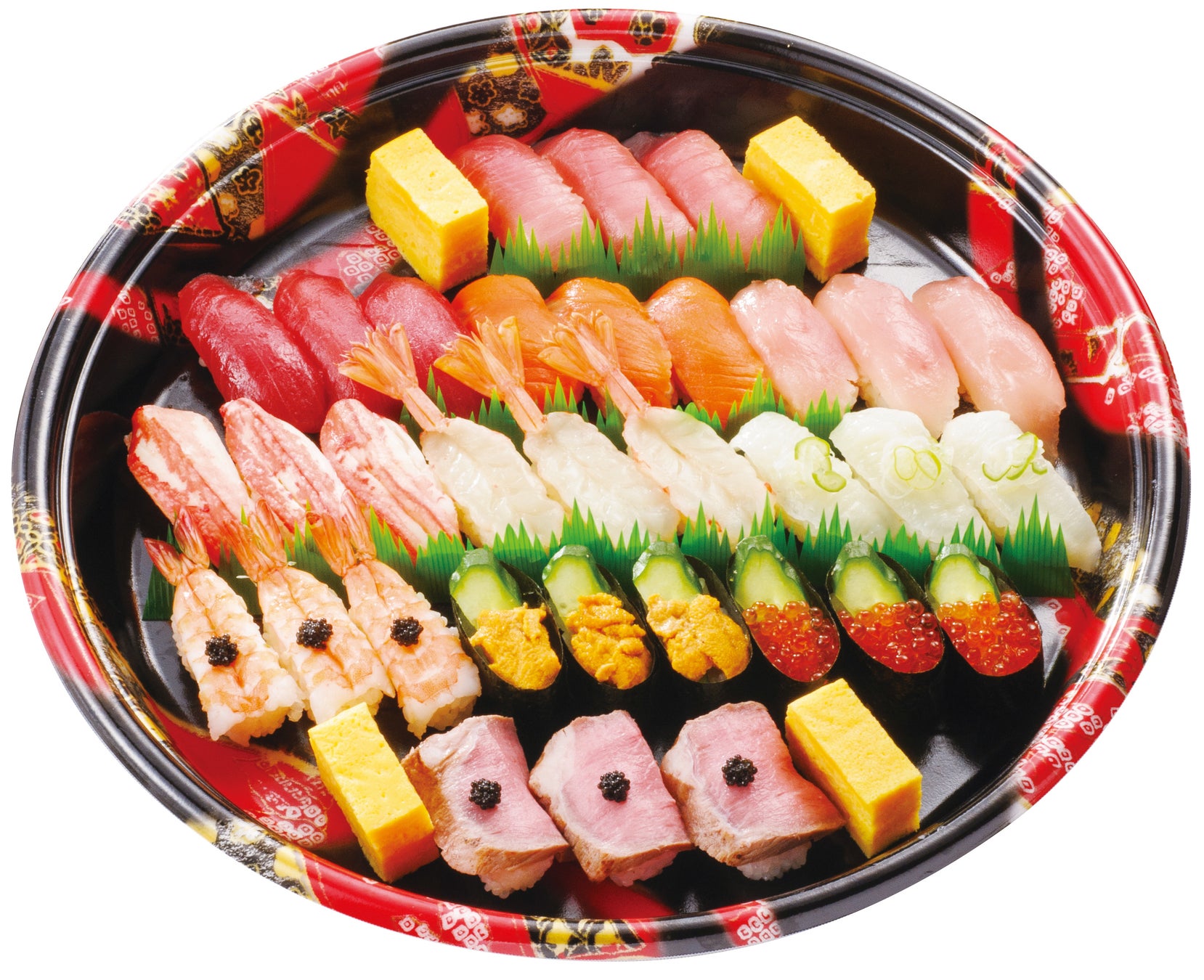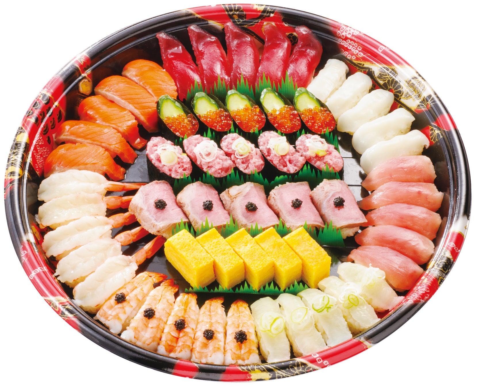 まぐろ中トロ、まぐろ、サーモン、びんちょうまぐろ天身、本ずわいがに、赤海老、えんがわ、厚焼き玉子、蒸し海老ランプフィッシュキャビアのせ、うに、いくら、ローストビーフランプフィッシュキャビアのせ(北海道産牛肉使用・直火焼き)