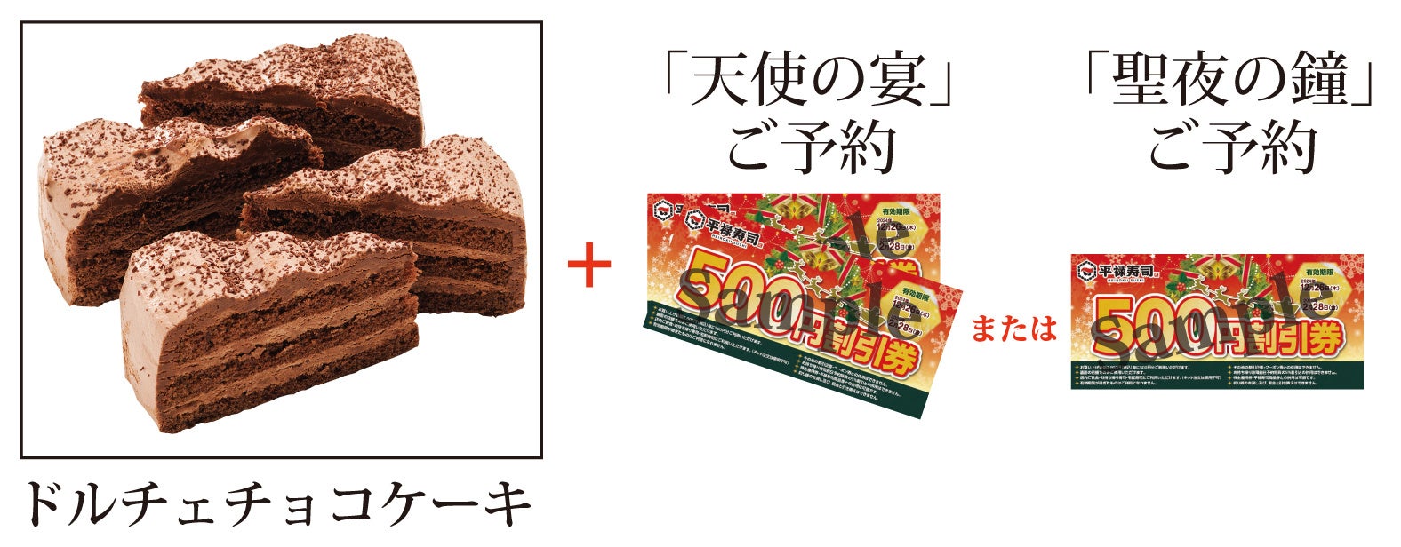 1967年創業以来1貫1貫、真心を込めてお寿司を握り続けてきた「平禄寿司」では、12月のクリスマスシーズンにピッタリの「お寿司」のパーティーセットを12月20日(金)~25日(水)まで6日間限定でご用意いたしました。まぐろ、いか、びんちょうまぐろ天身など11種類のお寿司を盛り込んだ「天使の宴」(5人前[55貫]:わさび抜き)。まぐろ中トロ、赤海老、本ずわいがになど12種類のお寿司を盛り込んだ「聖夜の鐘」(3人前[37貫]:わさび抜き)。など7種類のスペシャルメニューをご用意いたしました。また、12月21日(土)までに「天使の宴」または「聖夜の鐘」のご予約をいただきますとドルチェチョコケーキや割引券などの予約特典もございます。美味しさとお得感の詰まった「平禄寿司のクリスマスセット」をぜひ、お楽しみください。