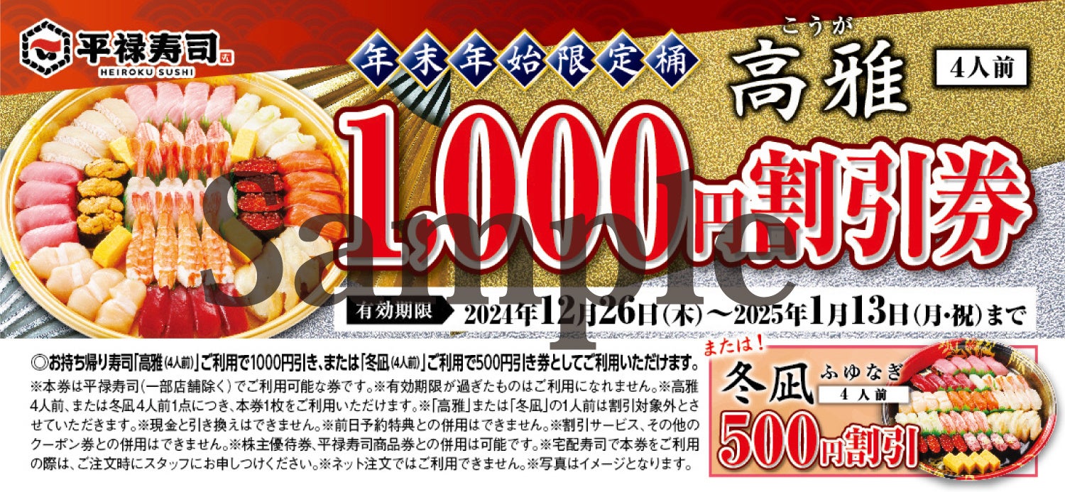 さらに、「天使の宴」または「聖夜の鐘」1個お買い上げ毎に、年末年始限定桶の「高雅(4人前)」もしくは「冬凪(4人前)」に使える割引券1枚プレゼントいたします。