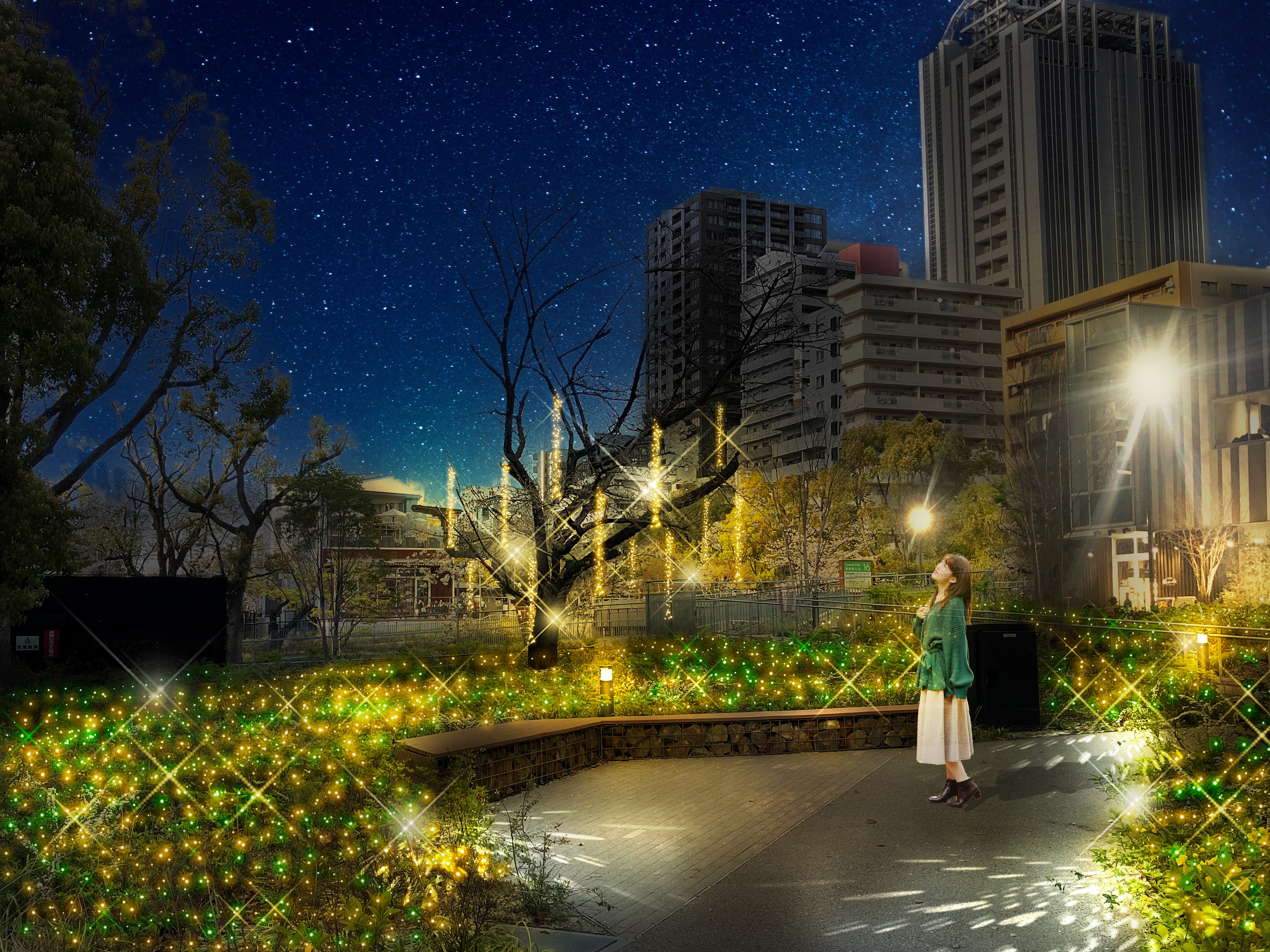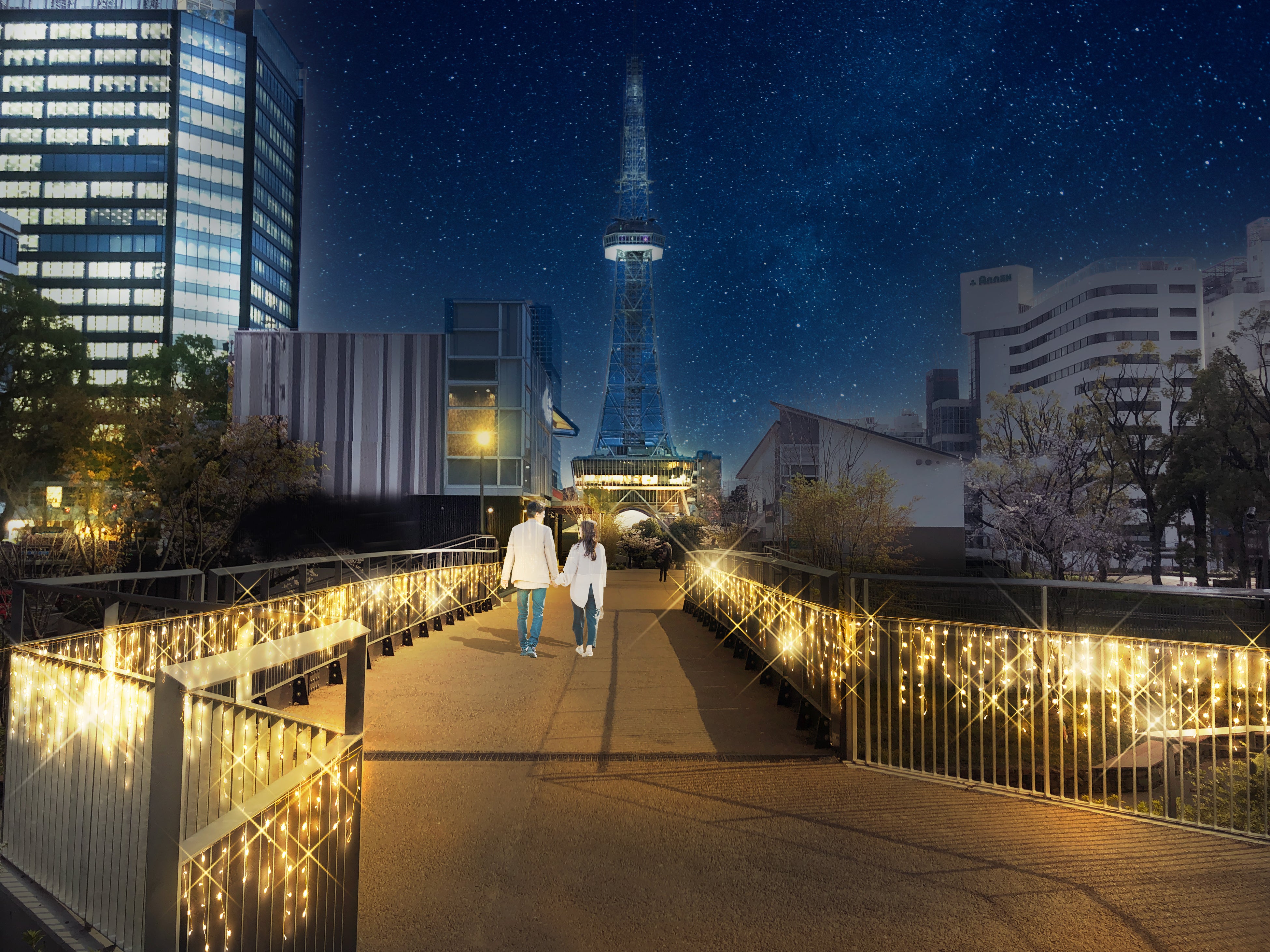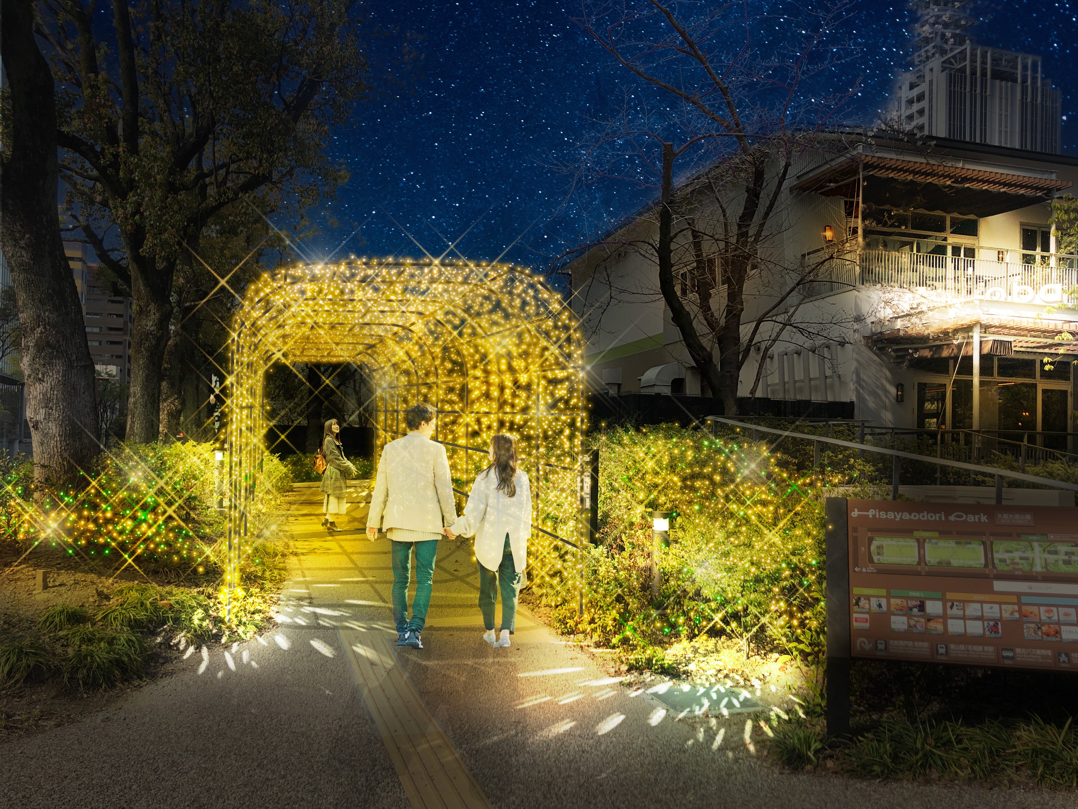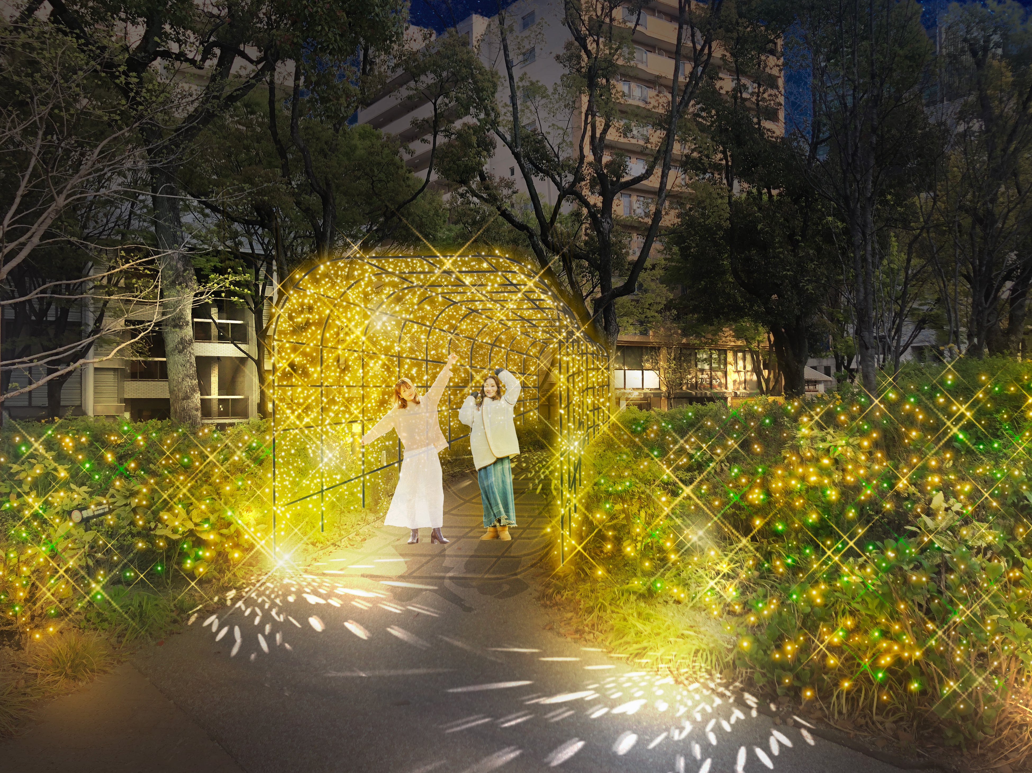 「光の散歩道」をテーマに名古屋 Hisaya-odori Parkのウインターイルミネーションを施工/ 幅広い世代に人気のゴールドのイルミネーションが公園内を光でつなぐ