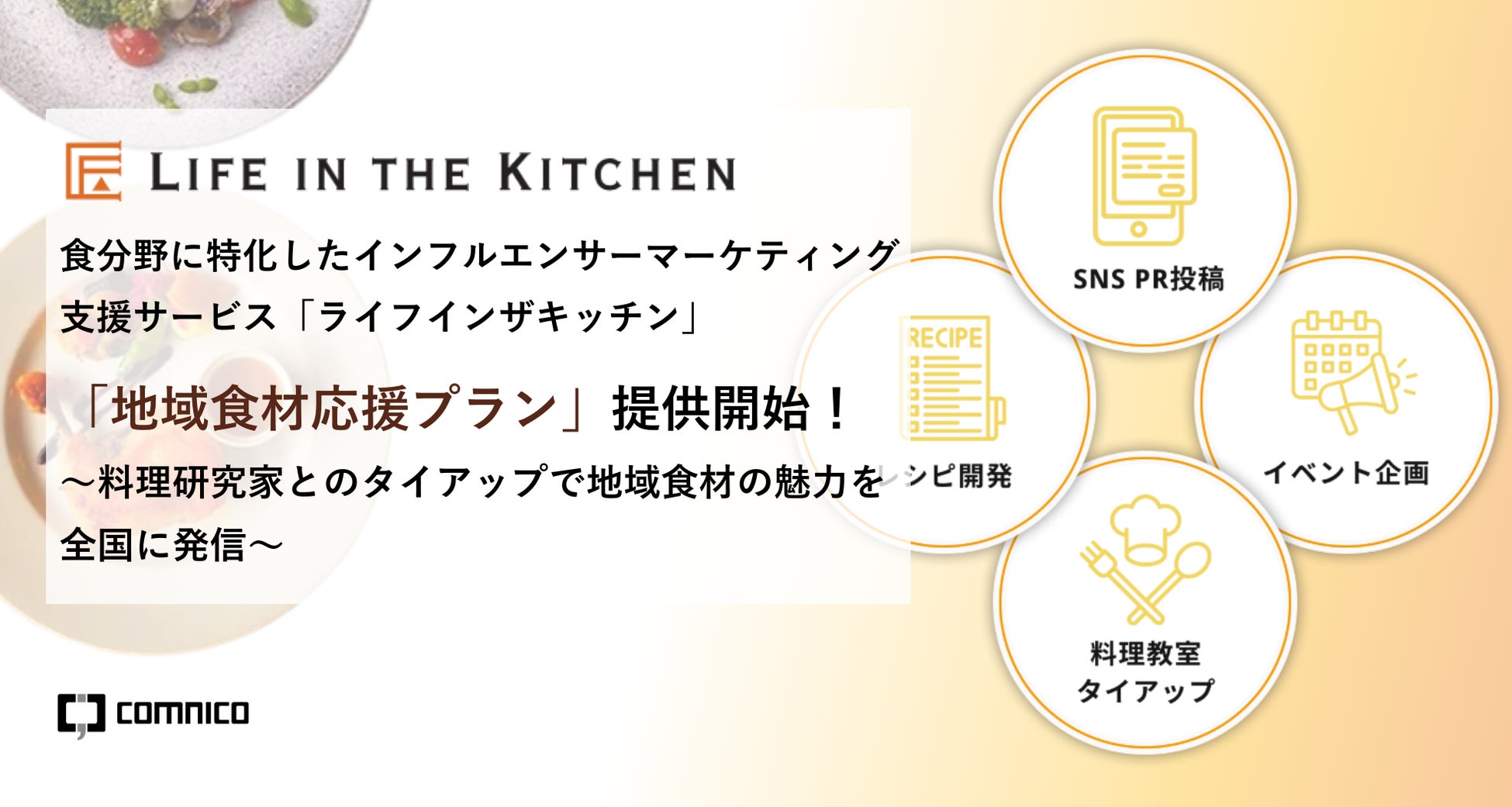 株式会社ラバブルマーケティンググループ(本社:東京都港区、代表取締役社長:林 雅之、証券コード:9254)の子会社で、企業のSNSマーケティングを支援する株式会社コムニコ(本社:東京都港区、代表取締役:長谷川 直紀、以下 コムニコ)は、食分野に特化したインフルエンサーマーケティング支援サービス「Life in the Kitchen(ライフインザキッチン)」から、新たに「地域食材応援プラン」を提供開始いたします。