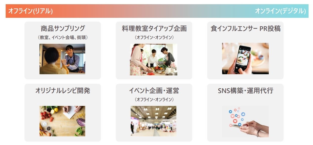 「ライフインザキッチン」は、国内約2,000の料理教室や料理教室を運営する料理研究家、食関連の情報を発信するインフルエンサーなどのネットワークを活かし、企業や団体のマーケティングを支援するサービスです。各企業や団体のブランドイメージに沿った料理教室や料理研究家、食インフルエンサーをマッチングし、タイアップのSNS投稿やレシピ開発、サンプリングイベントなど、オンライン/オフラインに関わらずさまざまな施策を企画から実行まで一気通貫で支援します。タイアップが可能な料理教室や料理研究家が日本国内全域に存在するため、各地域の食材の魅力を全国に発信できます。