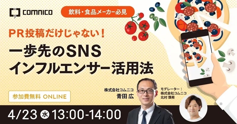 コムニコの「ライフインザキッチン」事業担当者が登壇する、無料オンラインセミナー「PR投稿だけじゃない!一歩先のSNSインフルエンサー活用法」を、4月23日(水)13時から開催いたします。本セミナーでは、料理研究家や飲食系インフルエンサーを活用することで、ターゲット層へのリーチやエンゲージメントを向上させる方法を具体的に解説します。「ライフインザキッチン」のサービスについてもご理解いただける内容です。ぜひご参加ください。