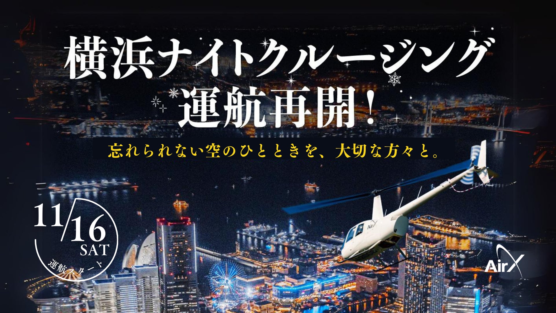 株式会社AirXは、2024年11月16日より、横浜南ヘリポート発着の「横浜ナイトクルージングプラン」を再開いたします。本フライトでは、横浜みなとみらい21地区や東京の上空を巡り、貸切ヘリコプターから美しい夜景をお楽しみいただけます。