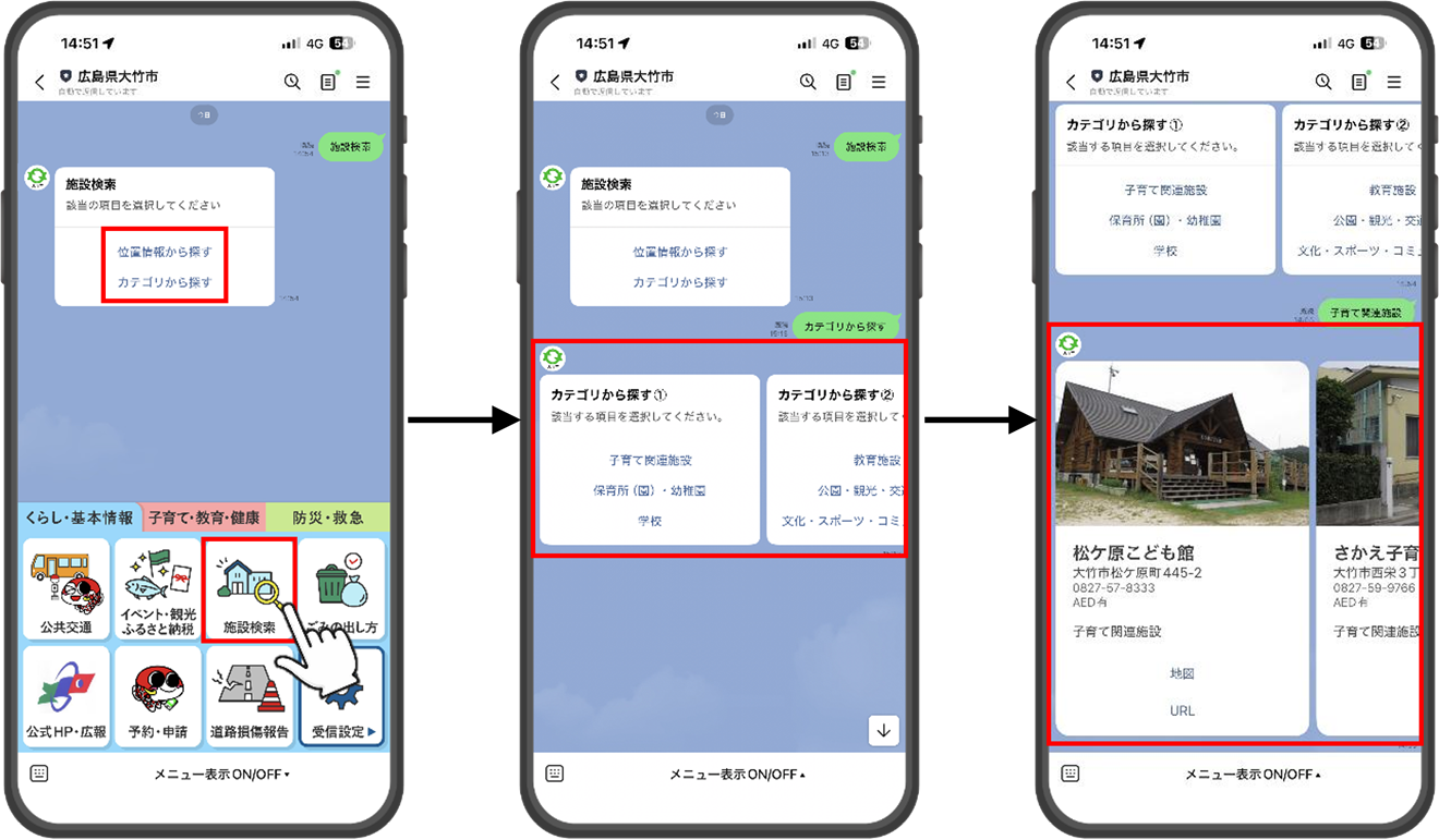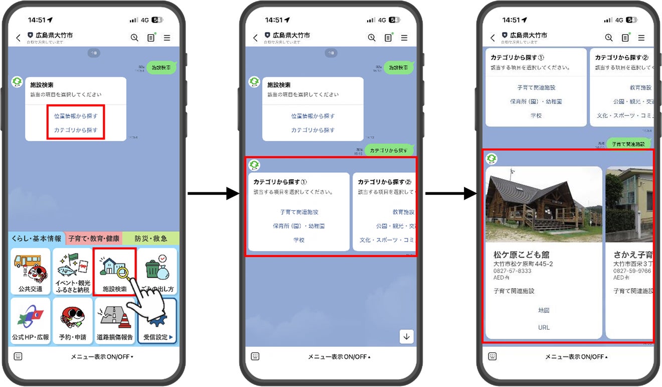 施設や観光スポットを検索することができる機能を導入しました。チャットボットの案内にしたがって、知りたいジャンルの施設を一覧表示させたり、自分の位置から近いスポットを検索したりすることが可能です。