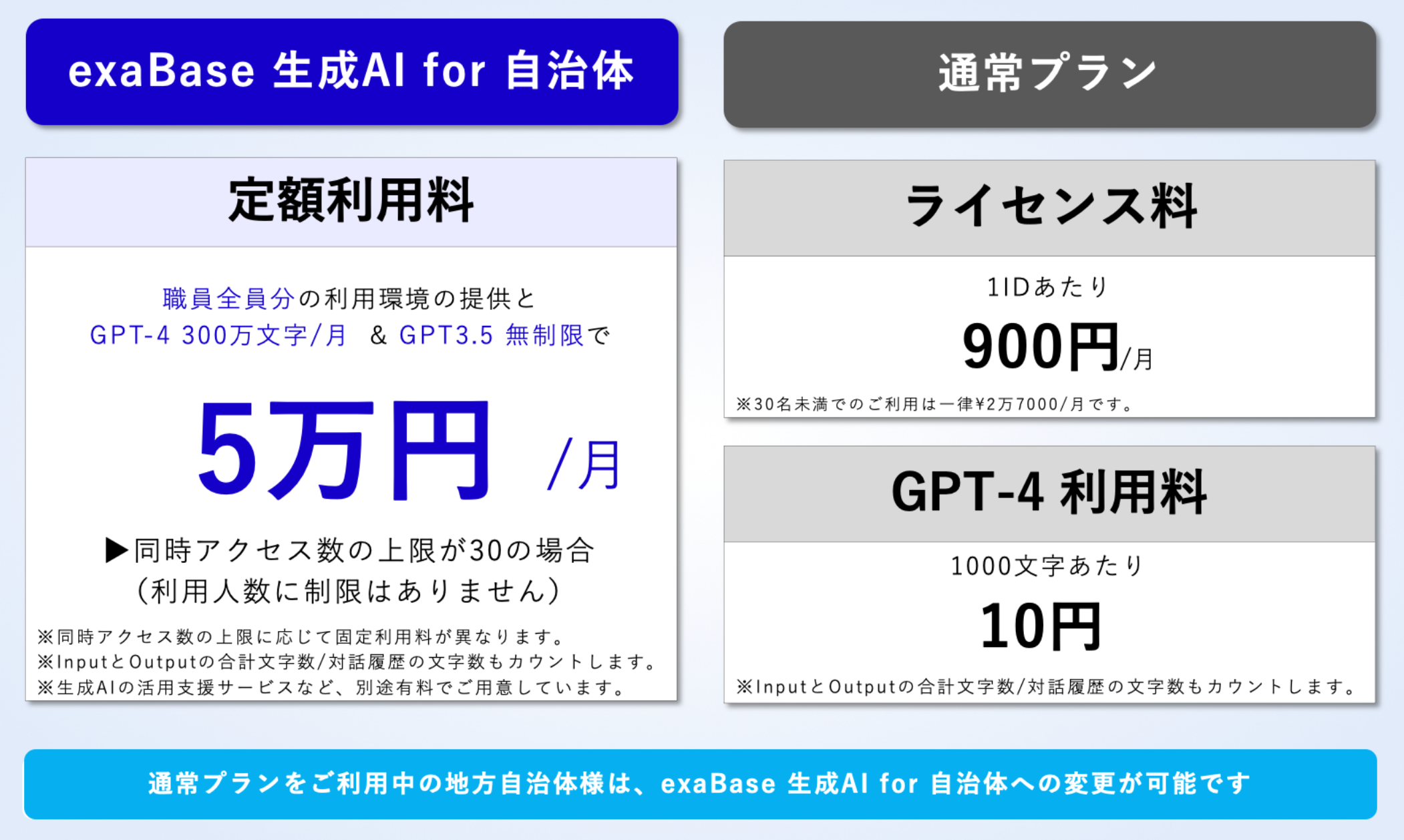 さらにexaBase 生成AIはGPT-3.5でのプロンプトの入出力を無料としており、地方自治体など行政機関において、より広い部門・部署を対象とした一括導入をご検討いただける条件としました。