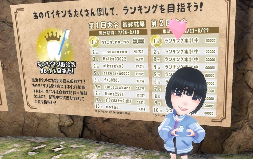 あのちゃんねるコラボ空間「あのちゃんねる Presents 井口の歯おそうじ大作戦」では、7/26(金)に公開して以来、8/13(火)までの19日間の累計プレイ時間が196時間を超えるヘビーユーザーも出現。ハイスコアをユーザー同士が競い合い、驚異的な熱気を帯びています。ウエストランド井口さんの歯の中に突入した累計数は66,000回を突破しました。