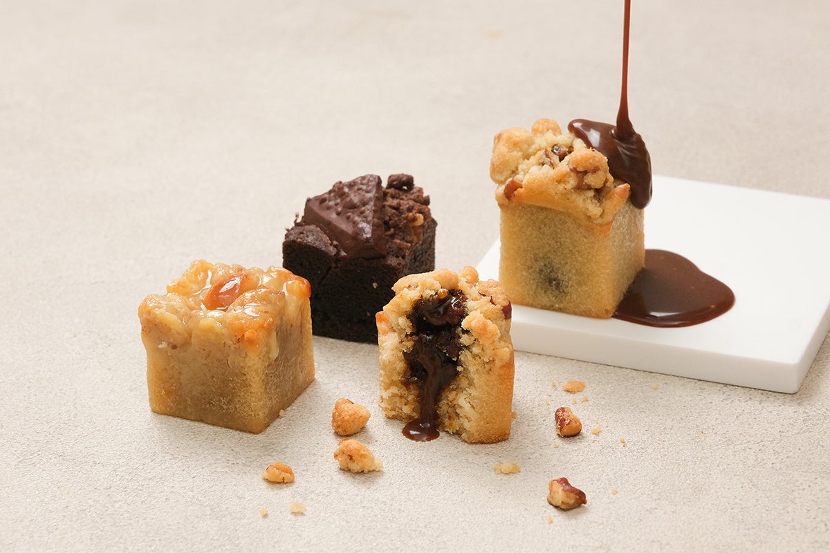バターがふくよかに香るフィナンシェ生地の中に、ジャムやクリームなどを閉じ込めることで、しっかりと食べごたえがありながら、それでいて繊細な作りの新感覚焼き菓子「フィナンシェケーキ」をオリジナルで開発しました。リッチなフレーバーを実現するために、通常のフィナンシェとは異なる立方体型の型を採用し、外はカリッとした食感を残しつつ、中にしっとりとしたジャムやクリームを楽しめます。