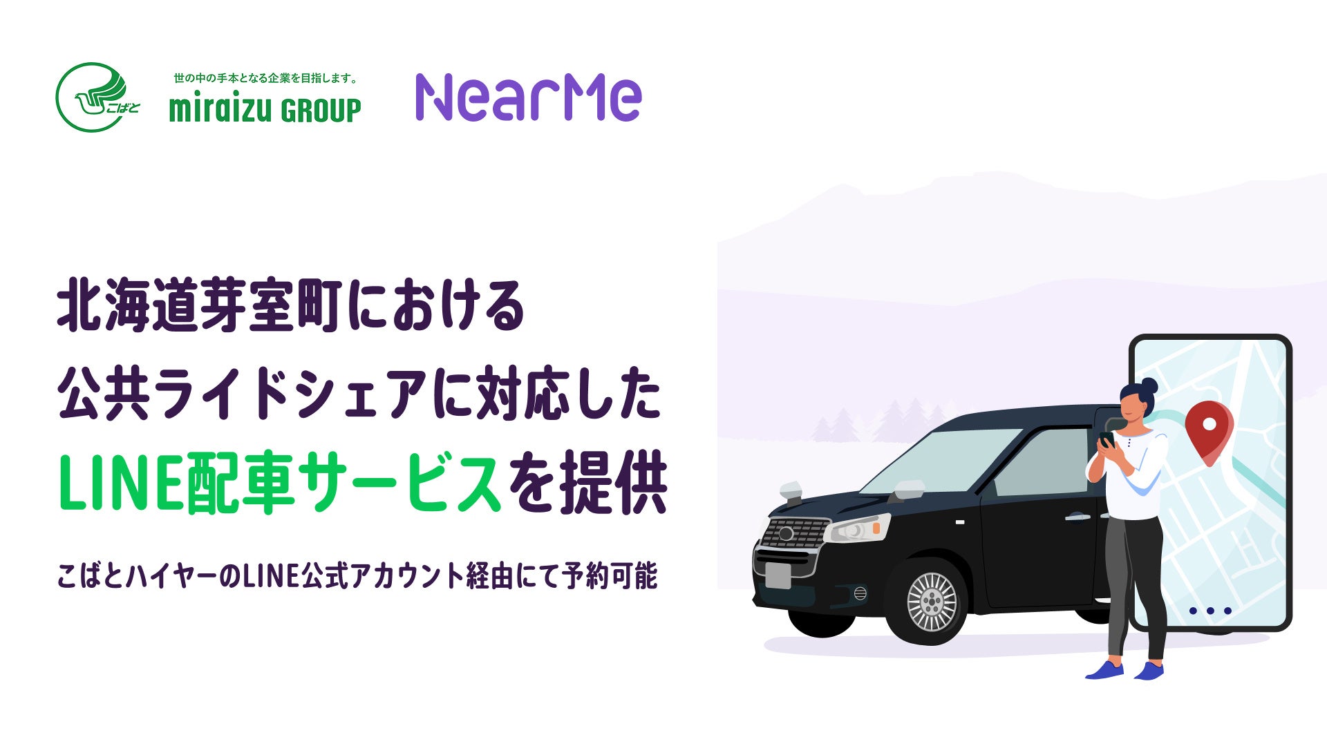 移動に関する課題解決に取り組むソーシャルデザインカンパニー、株式会社NearMe(本社:東京都中央区、代表取締役社長:髙原幸一郎、以下「ニアミー」)は、北海道芽室町にて2026年2月2日(月)より開始される公共ライドシェアにおいて、株式会社ミライズグループ(本社:北海道帯広市、代表:小林義幸)のグループ会社であるこばとハイヤー株式会社(本社:北海道根室町、以下「こばとハイヤー」)と連携し、LINEを活用した配車サービスを提供します。