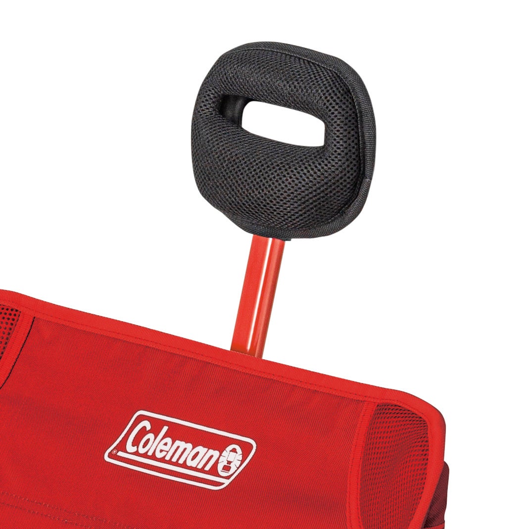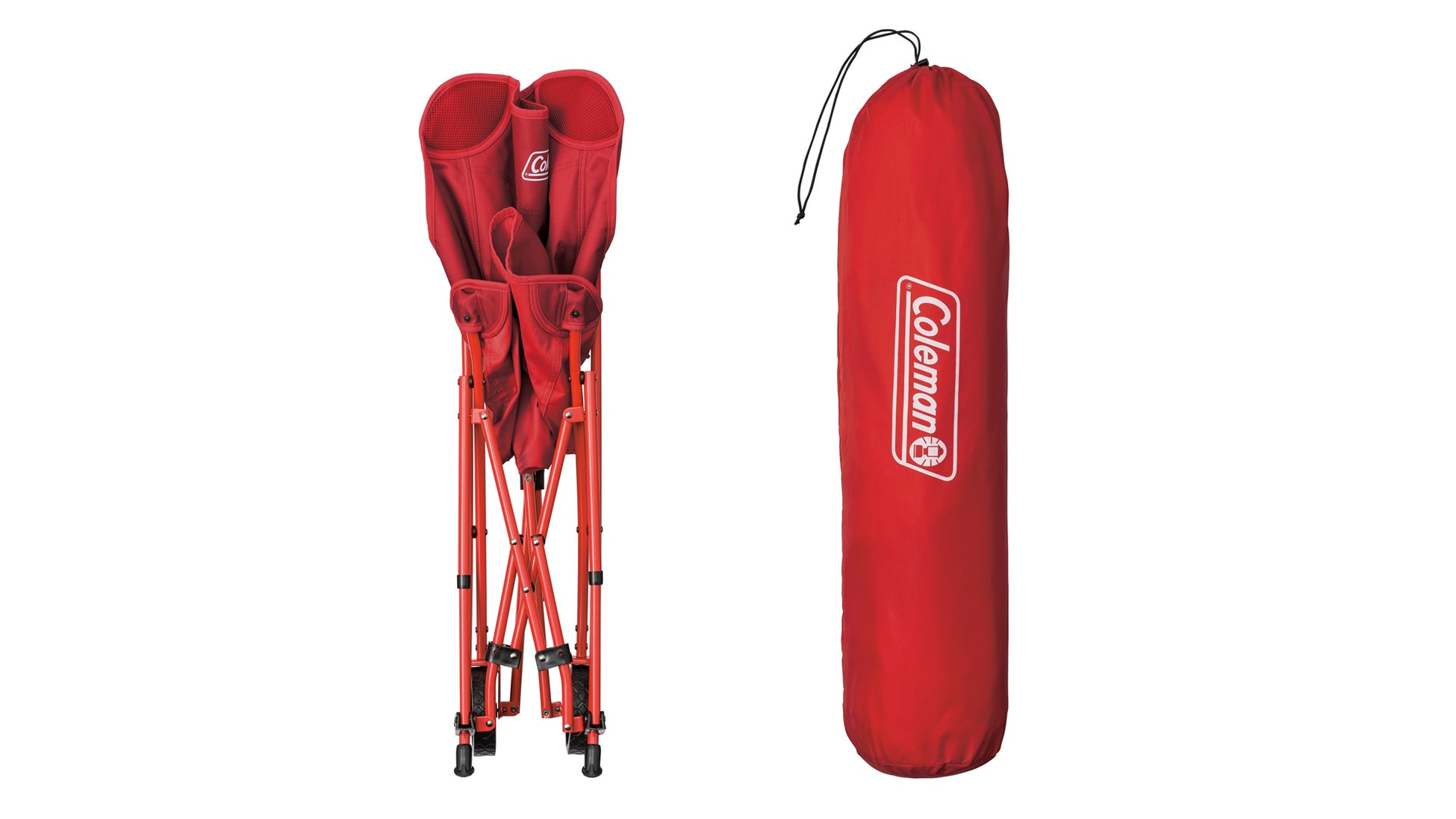 「ワンマイルチェア」は、キャリーとチェアが一体化した便利な2WAY仕様のアイテムです。コールマンレッドのローチェアにタイヤが付き、アウトドアレジャーやイベントでの荷物運搬に役立ちます。