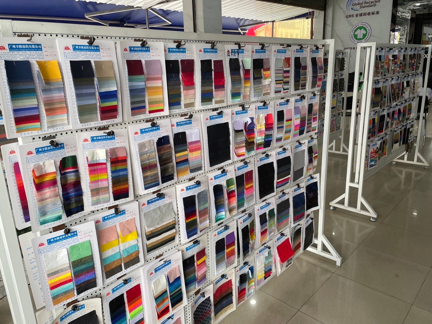 品質管理が終了した後には、お客様の生地選びの選択肢を広げるため、広州の巨大生地市場を訪問。市場には大量の生地店が所狭しと並び、すべて回るには数日間必要と言われるほどです。各店内には「スワッチ」と呼ばれる生地見本が豊富に展示されており、当社のグッズディレクターが進行中の案件にふさわしい生地を数多く収集しました。