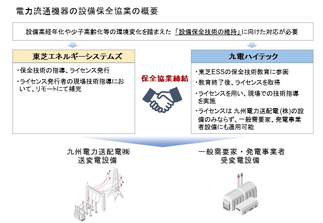 東芝エネルギーシステムズ株式会社(本社:神奈川県川崎市、代表取締役社長:四柳端、以下「東芝ESS」)と、株式会社 九電ハイテック(本社:福岡県福岡市、代表取締役社長:山﨑尚、以下「QHT」)は、この度、開閉器や変圧器などの電力流通機器を高度かつ効率的に保全していくための協業(以下「本協業」)について合意しました。