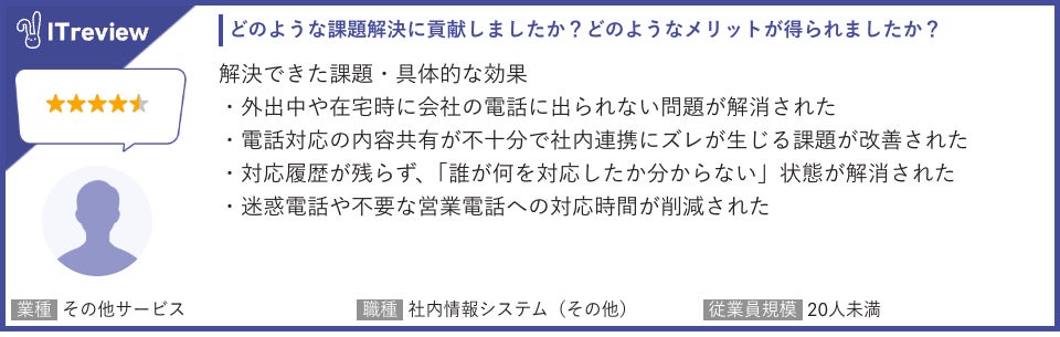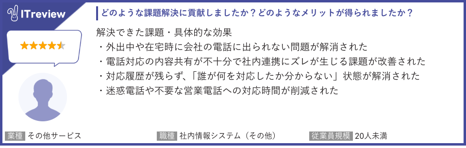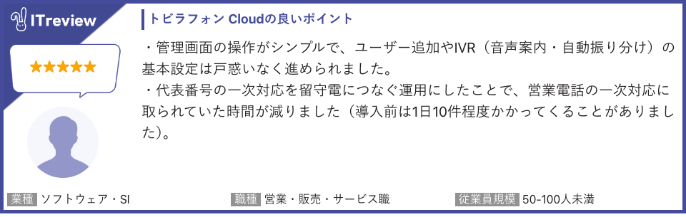 「トビラフォン Cloud」は「ITreview」で平均顧客満足度4.3を獲得しています(2026年4月15日時点 108レビュー)。当製品のご利用者様から実際に寄せられたレビューを一部ご紹介します。