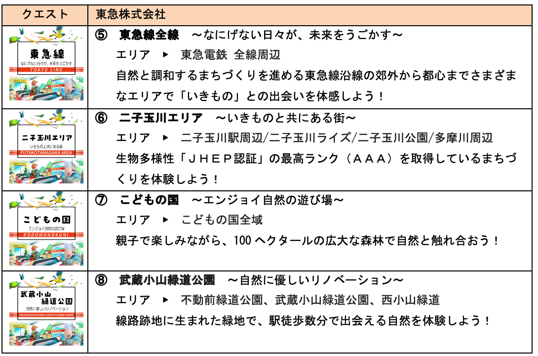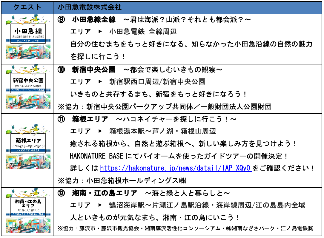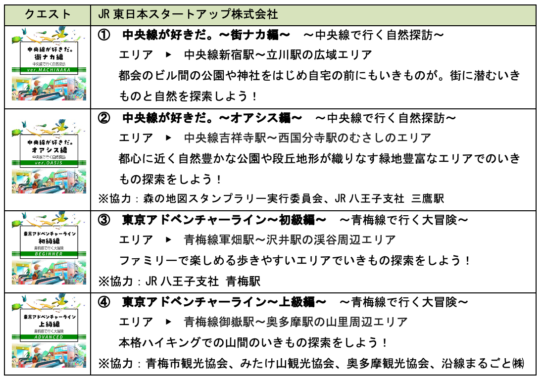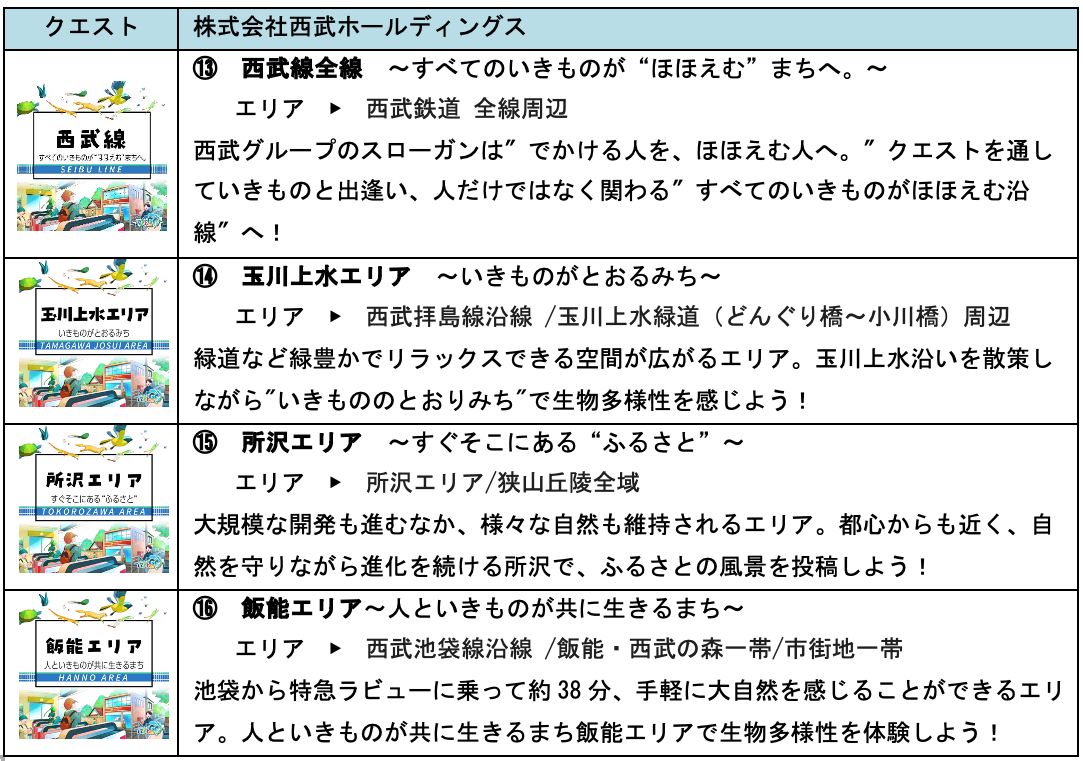 「駅からはじまるいきもの探し いきものGO」の開催期間中に配信されるクエスト一覧は下記の通りです。