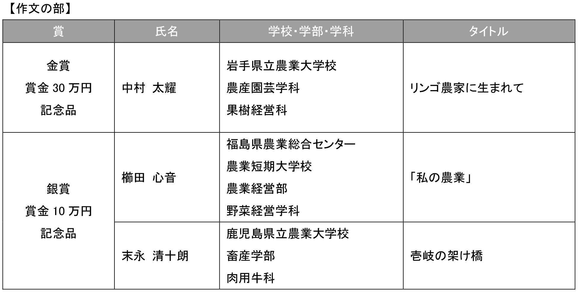 ※上記に加え、銅賞(賞金5万円/記念品)10編、奨励賞(賞状/記念品)15編の作文が選ばれました。