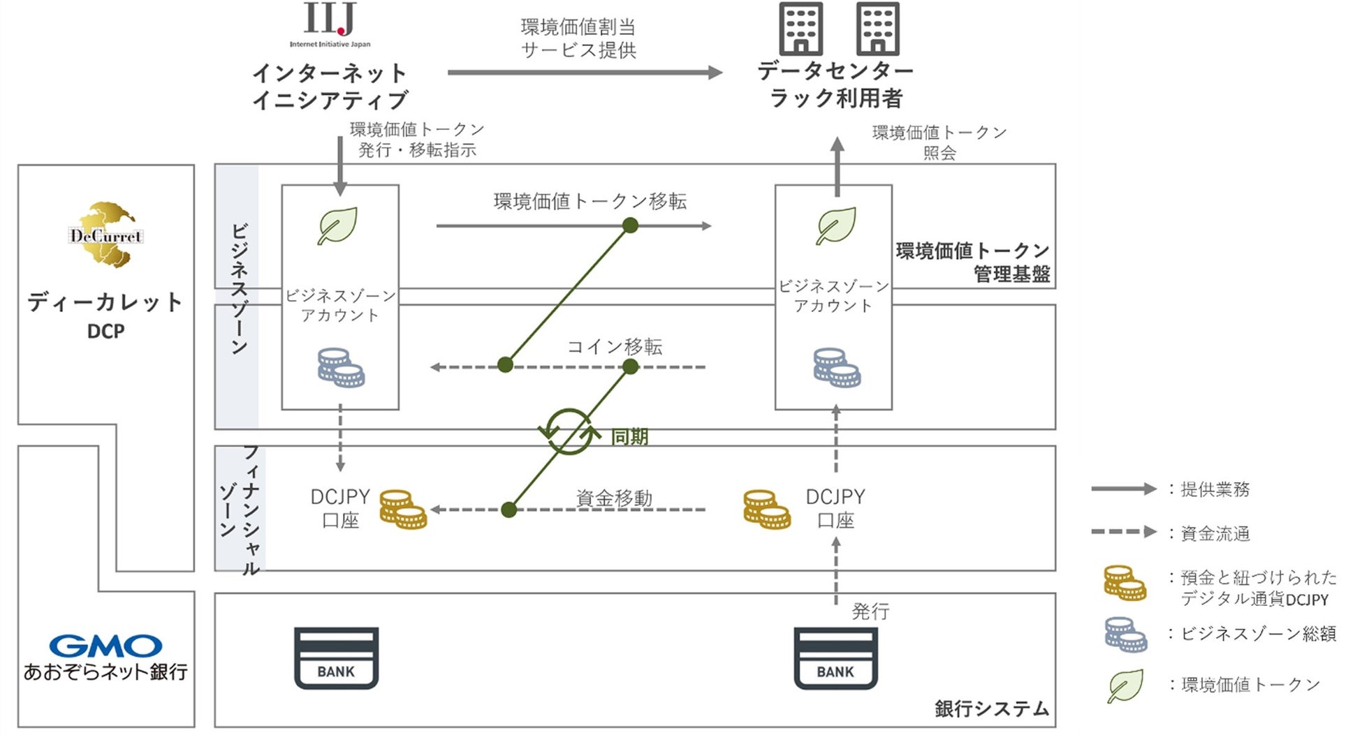IIJは、一般社団法人日本卸電力取引所の非化石価値取引会員に加入し、2023年10月から非化石証書を代理調達するサービスを提供開始いたしますが、2024年7月には、同サービスにおいてディーカレットDCPが提供するDCJPYネットワークを活用し、環境価値をデジタルトークン化したうえでデジタル通貨を利用しての決済を開始します。環境価値取引はブロックチェーン上で管理され、それと連動した効率的なデジタル通貨決済サービスをGMOあおぞらネット銀行が提供する仕組みです。