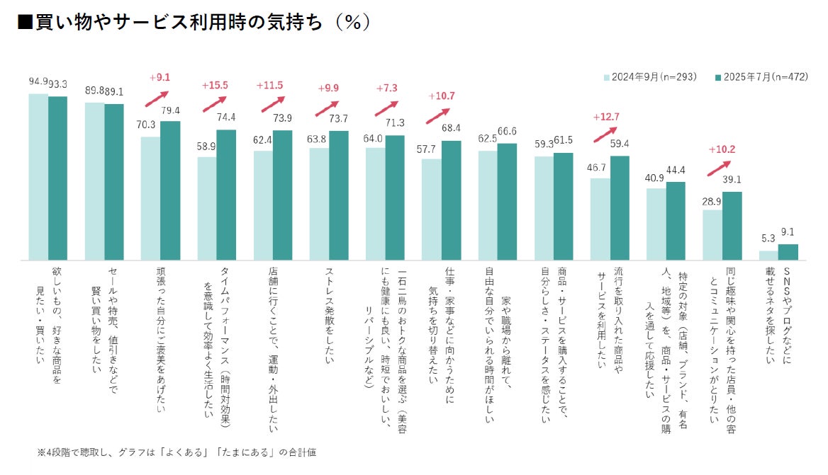 2024年9月と比べ、「頑張った自分にご褒美をあげたい」「ストレス発散をしたい」「仕事・家事などに向かうために気持ちを切り替えたい」などの心理的動機が10ポイント前後増加。また、「店舗に行くことで運動・外出したい」や「タイムパフォーマンスを意識して効率よく生活したい」「一石二鳥のおトクな商品を選ぶ」なども増加した。