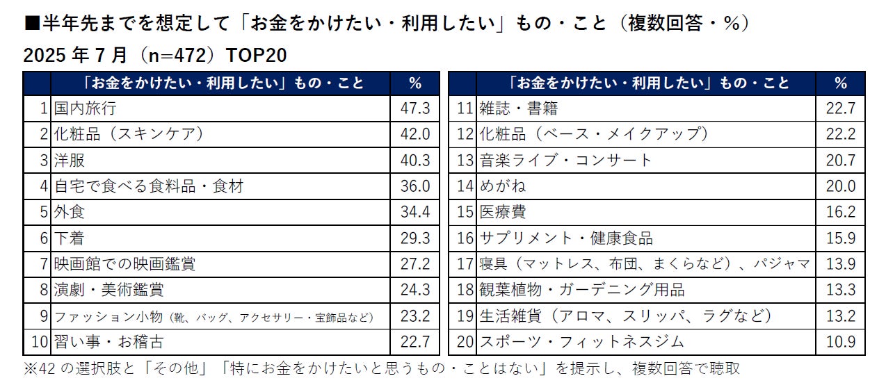 半年先までを想定して「お金をかけたい・利用したい」もの・ことを聞いたところ、1位は「国内旅行」47.3%だった。なお、「海外旅行」は10.5%で20位以内には入らなかった。