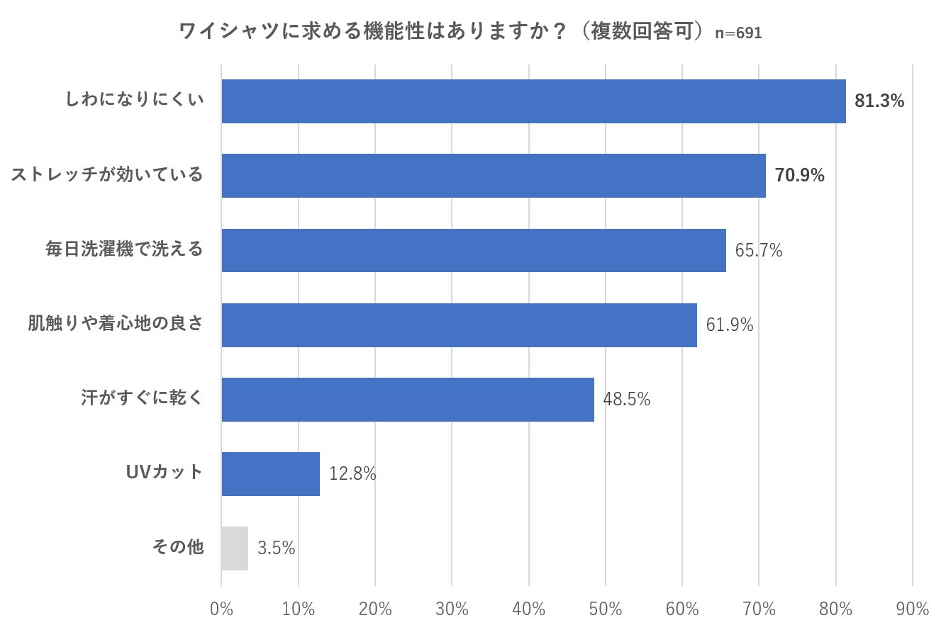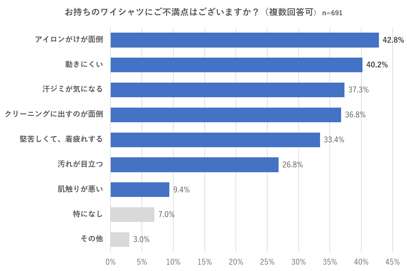 ビジネスシーンで着用するワイシャツについて、WWSオンラインサイトメールマガジンの男性会員691名を対象に実施したアンケート(※資料1)では、「現在所持しているワイシャツへのご不満点」として、“アイロンがけが面倒”、“動きにくい”、“汗ジミが気になる”、“クリーニングに出すのが面倒”が挙げられました。さらに、ワイシャツに求める機能性として、“しわになりにくい”、“ストレッチが効いている”が求められていることが判明しました。