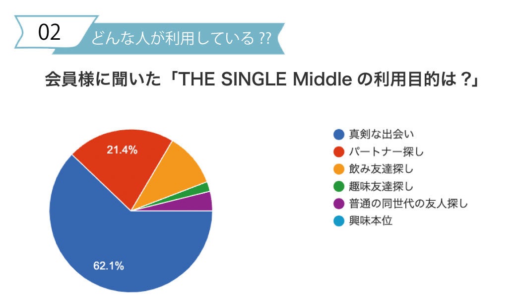 私たちTHE SINGLEでは「会う」という行動を大事だと考えております。オミカレ婚活実態調査の婚活、恋活をするにあたって一番需要視しているポイントでは「人柄」が男女ともに1位となっております。この人柄というのはあって話してみて初めて感じることのできる重要な部分です。そういった点では皆様が大事に考えられている部分を一番に触れられるのはTHE SINGLEのサービスの最大の強みであり、他では得られない出会いをマッチングできると考えています。縁結びのプロフェッショナルとして皆様へ素敵な出会いをご案内できるよう今後も精進してまいります。