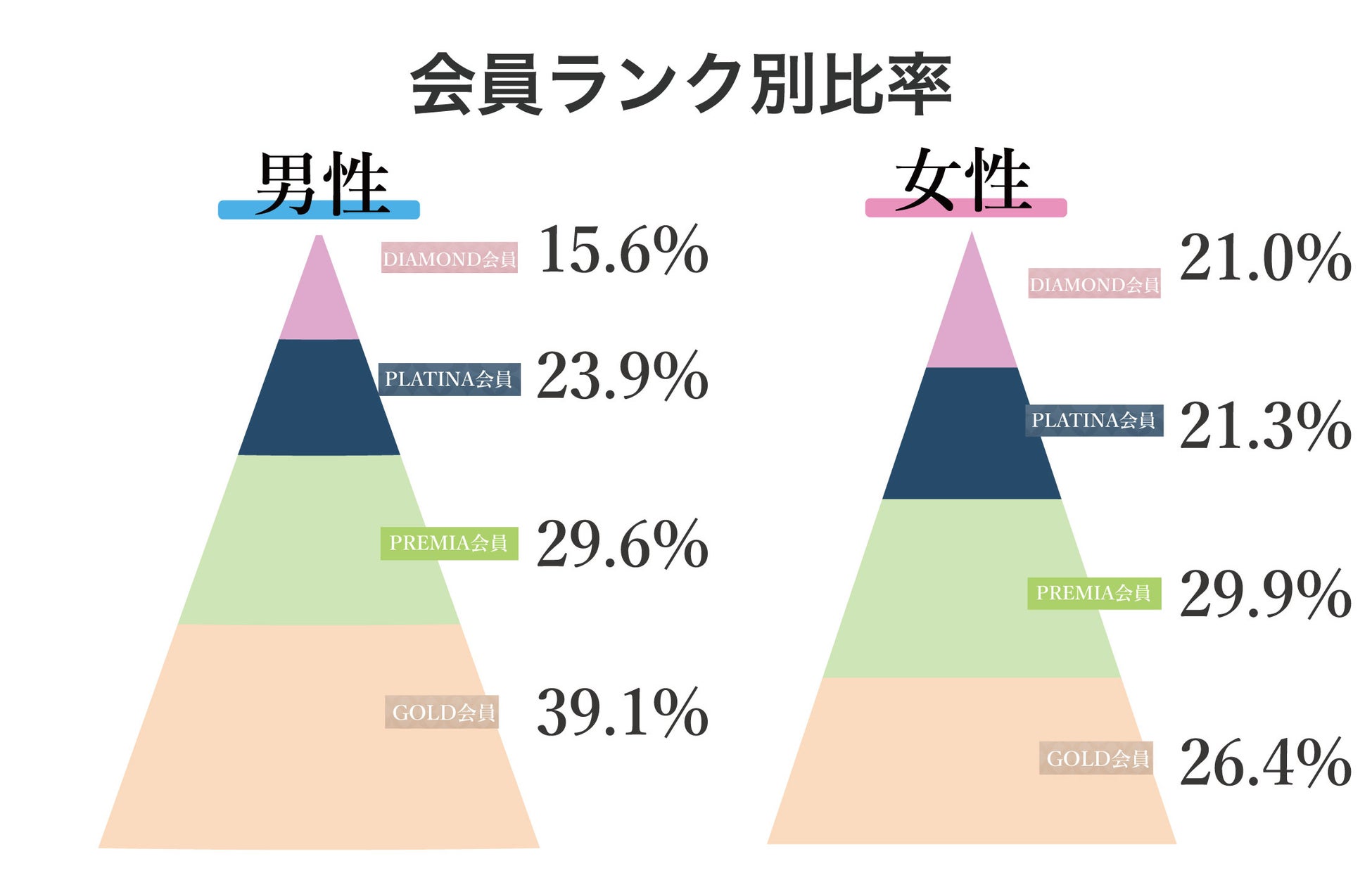 2024年8月のTHE SINGLEの会員ランク別比率は、男性は、DIAMOND会員が15.6%、PLATINA会員が23.9%、PREMIA会員が29.6%、GOLD会員が39.1%となりました。また、女性は、DIAMOND会員が21.0%、PLATINA会員が21.3%、PREMIA会員が29.9%、GOLD会員が26.4%となりました。