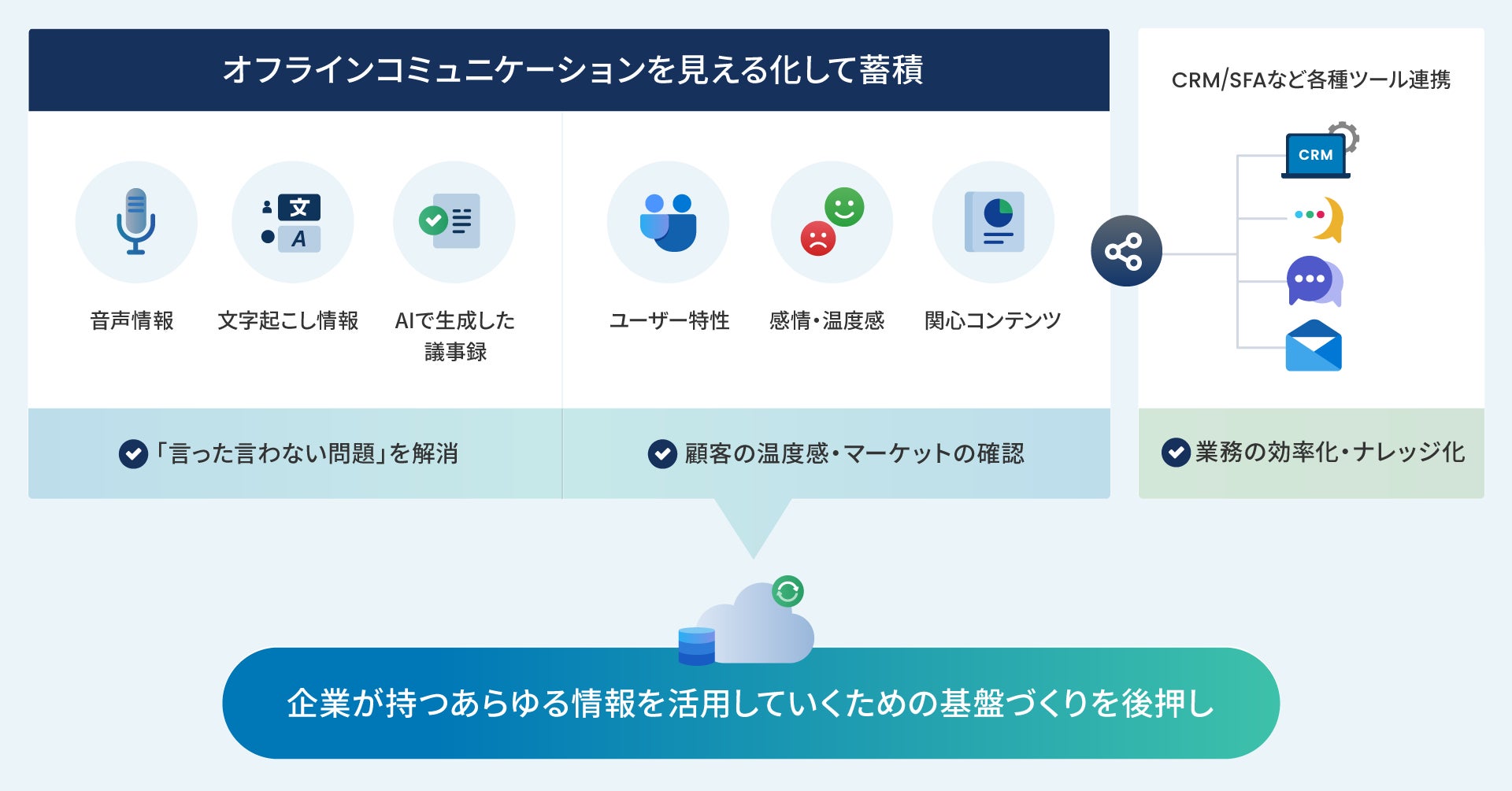 担当者の議事録作成や日報作成、CRM、SFAへの入力といった業務を大幅に削減すると同時に、俯瞰的なマーケット動向の確認やユーザー特性を定量的に可視化したり、ネクストアクションの示唆出しを可能にし、戦略的意思決定、管理者の指導工数削減、ユーザーの成長につなげます。蓄積されたデータは、今後生成AIが多用される環境において、企業が持つあらゆる情報を将来活用していくための基盤づくりを後押しします。