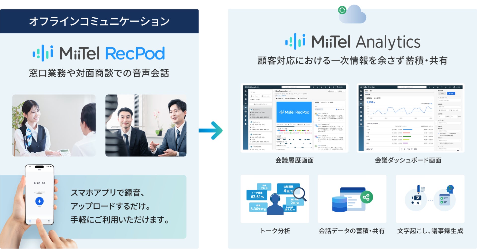 MiiTel RecPod(β版)提供開始により、これまで提供してきた電話でのやりとり(MiiTel)や、オンライン打ち合わせでのやりとり(MiiTel Meetings) に加え、オフライン(対面)の口頭でのコミュニケーションを、検索可能なデータとして蓄積します。