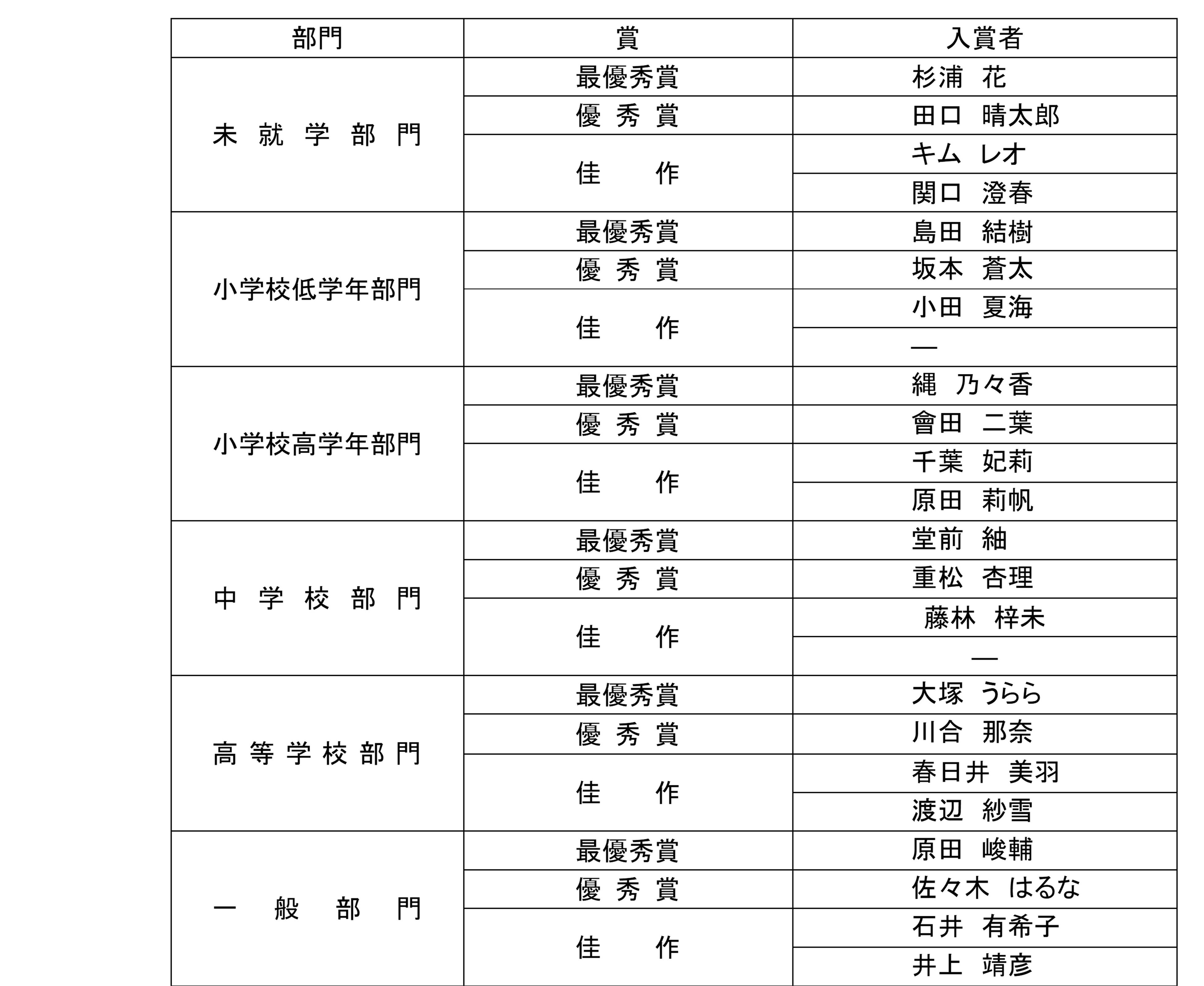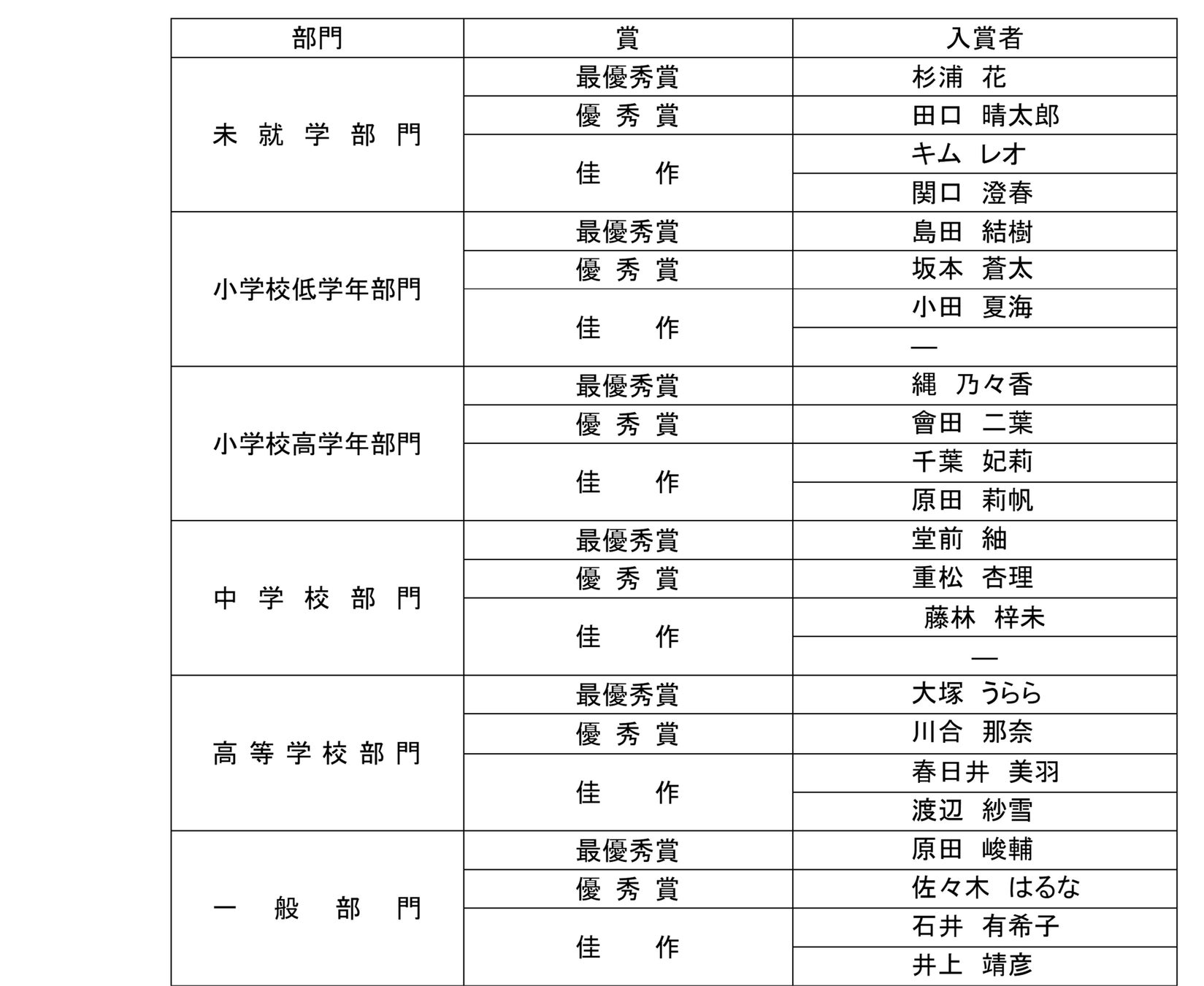 【募集部門】 未就学部門、小学校低学年部門、小学校高学年部門、中学校部門、高等学校部門、一般部門