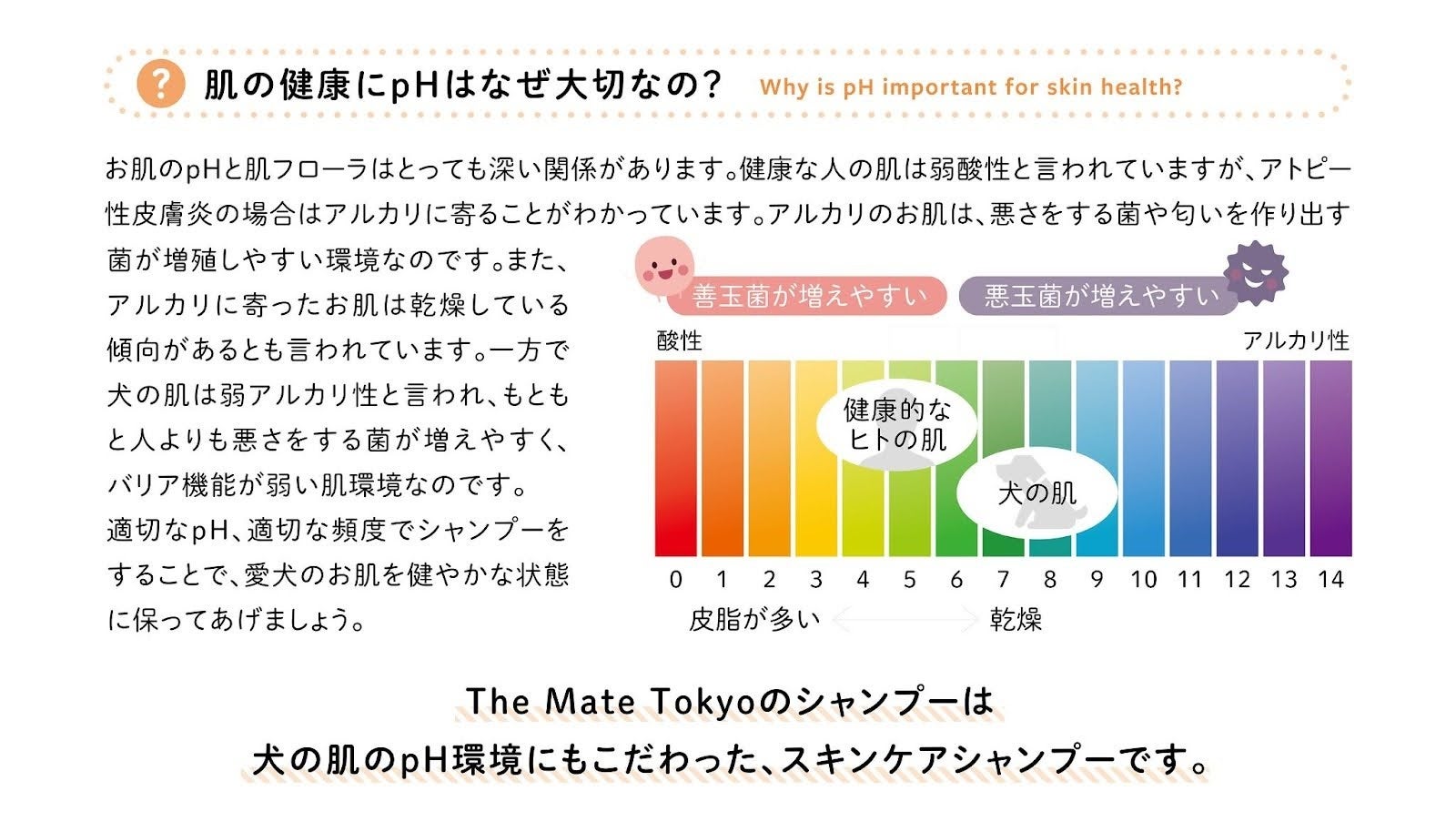 Aamzon累計販売数10,000個以上を突破するTHE MATE TOKYOのスキンケアシャンプーは、獣医師およびトリマーが成分設計を監修しています。犬のお肌は弱アルカリ性であり、人のお肌よりもバリア機能が弱いとされています。そのためTHE MATE TOKYOは、犬の肌のph値のバランスを考慮した、敏感肌のワンちゃんにも優しい低刺激な無添加処方の商品を提供しています。きめ細やかな泡が肌のすみずみまでいき渡り、余分な皮脂や角質をしっかりと除去しながら、お肌の潤いもを守ります。