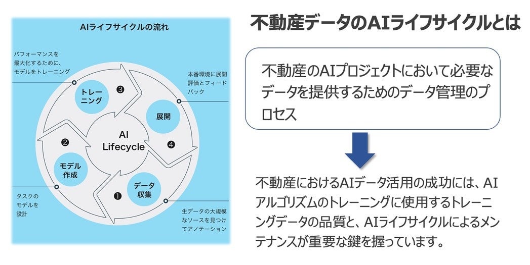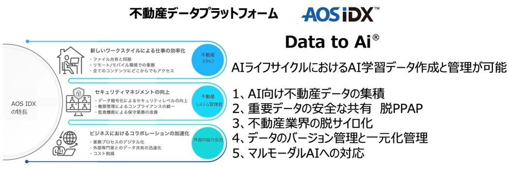 AOS IDXでは、こうしたAIライフサイクルの仕組みに基づき、AIデータにおけるAIシステムのためのAIデータ管理を行い、不動産における優秀なデータがあって初めて優秀なAIシステムを実現できるというData to AI®︎のコンプトの元、AOS IDXによって、不動産業務の効率化に向けたプラットフォーム構築を支援します。
