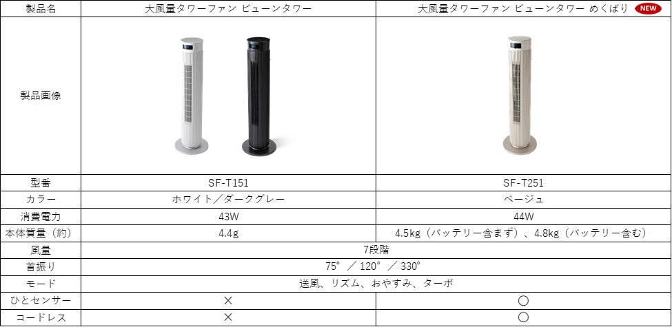 ▼機能比較表:既存モデル(SF-T151)/ビューンタワー めくばり(SF-T251)
