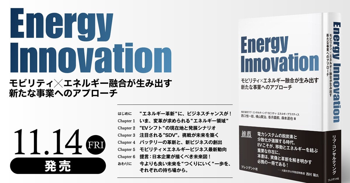 モビリティ領域に強みを持ち、大企業の事業開発領域支援からベンチャー・中堅企業の経営コンサルティングを行う株式会社リブ・コンサルティング(所在地:東京都中央区、代表取締役:関厳)はGX・EV領域における事業開発コンサルティングプロジェクトを通して得た独自の知見を基に、モビリティ×エネルギー領域の融合から生まれる新事業やビジネスのアプローチを探る提言をまとめた書籍『Energy Innovation』を、2025年11月14日(金)、プレジデント社より全国書店にて発売いたします。