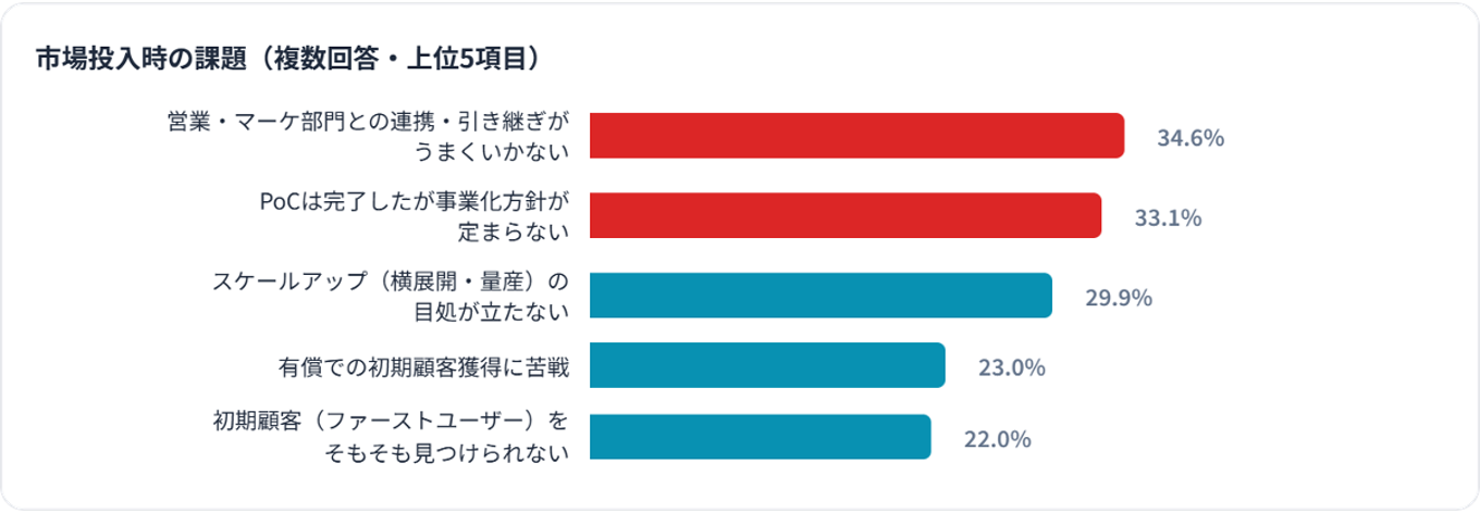 最大のボトルネックは「営業・マーケ部門との連携・引き継ぎがうまくいかない」(34.6%)と「PoCは完了したが事業化方針が定まらない」(33.1%)で、いずれも社内の組織間連携に関する課題が上位を占めた。