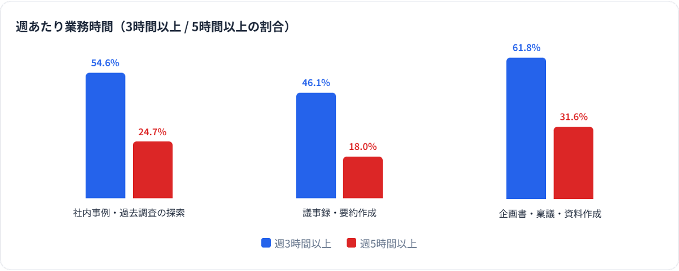 ◾️企画書・資料作成に週5時間以上が3割超。情報探索にも半数以上が週3時間以上を消費