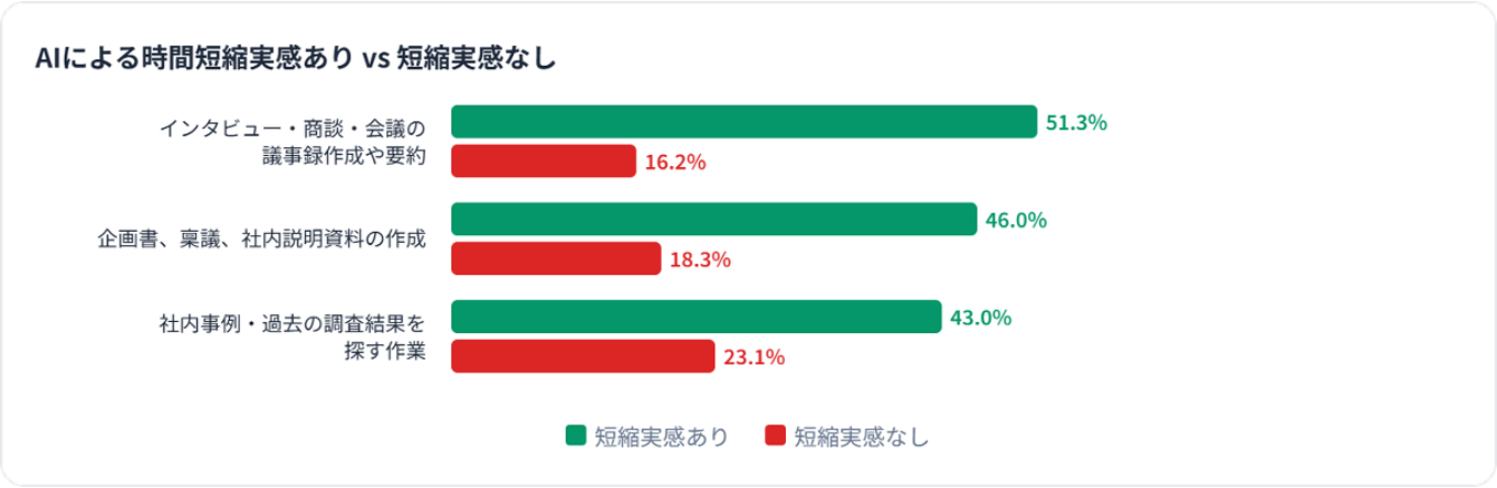 また、AI活用による時間短縮の実感を調査したところ、文字起こし・要約は51.3%が「短縮実感あり」と回答した一方、社内事例・過去調査の探索は43.0%にとどまりました。その一方で、今後AIに任せたい業務では社内事例・過去調査の検索が32.1%で3位に入っており、ニーズが高いにもかかわらず、現状では解決できていない業務課題が存在することがうかがえます。