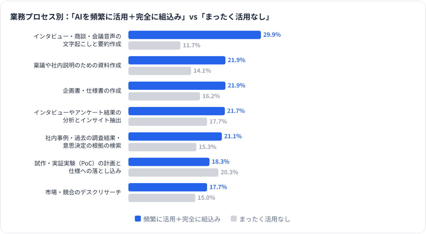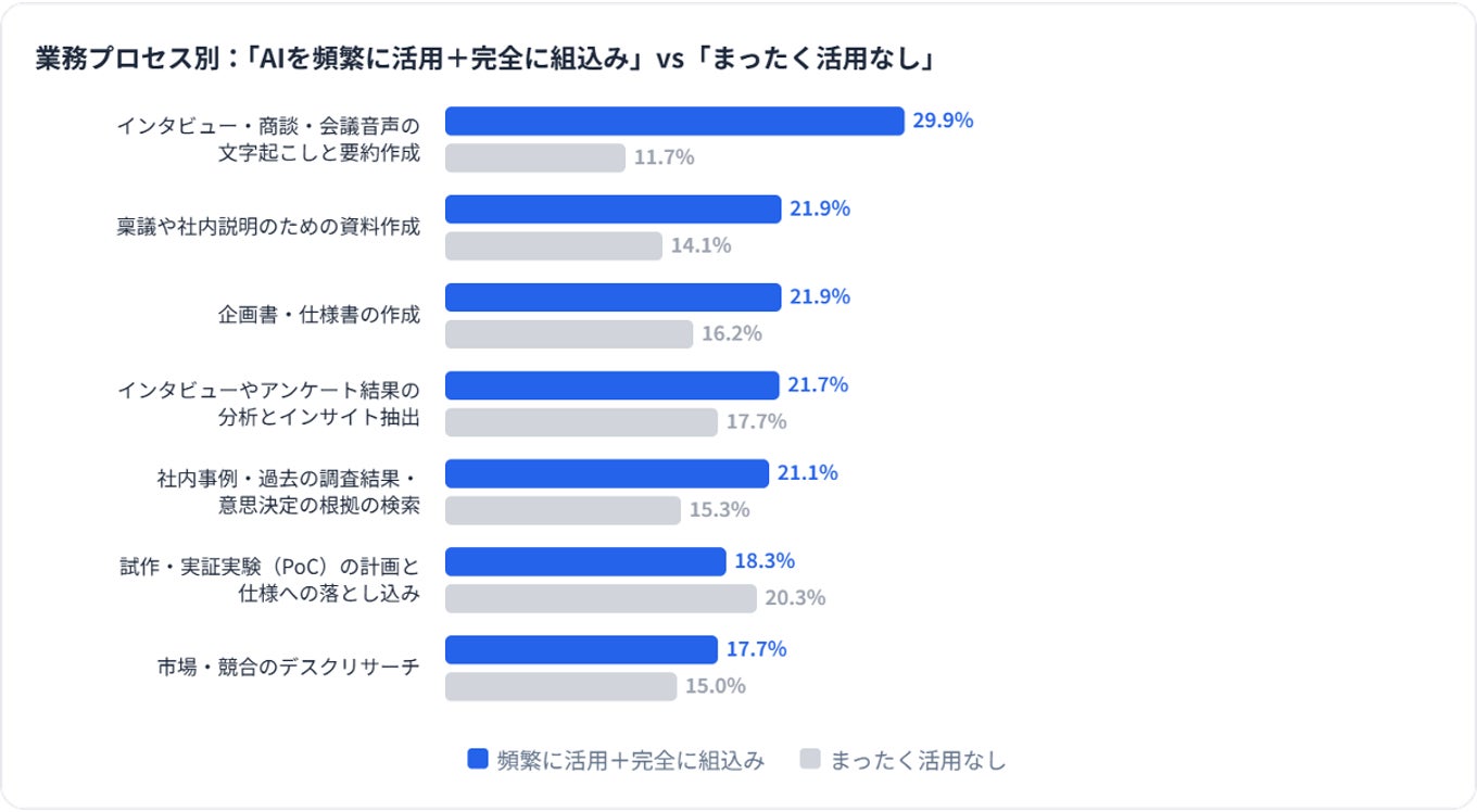 業務プロセス別にみたAI活用状況では、文字起こし・要約が最も浸透しており、約3割が本格活用しています。一方、PoC計画・仕様化やインサイト分析など判断を要する上流工程は限定的で、浸透の遅れがみられます。